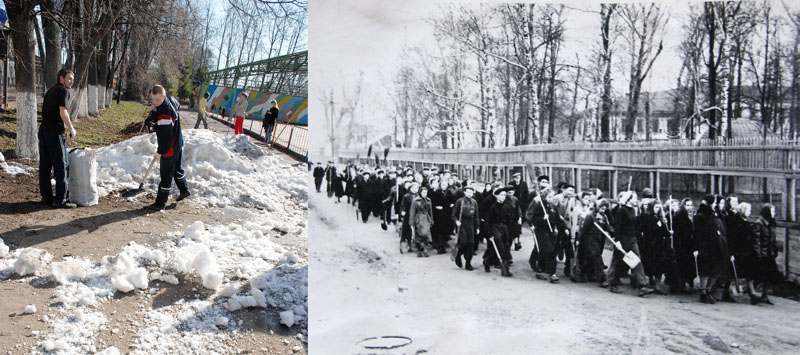 Для сравнения две фото. Сегодняшняя и 1958 года. Богородский кожевенный техникум на очистке прилегающей территории.