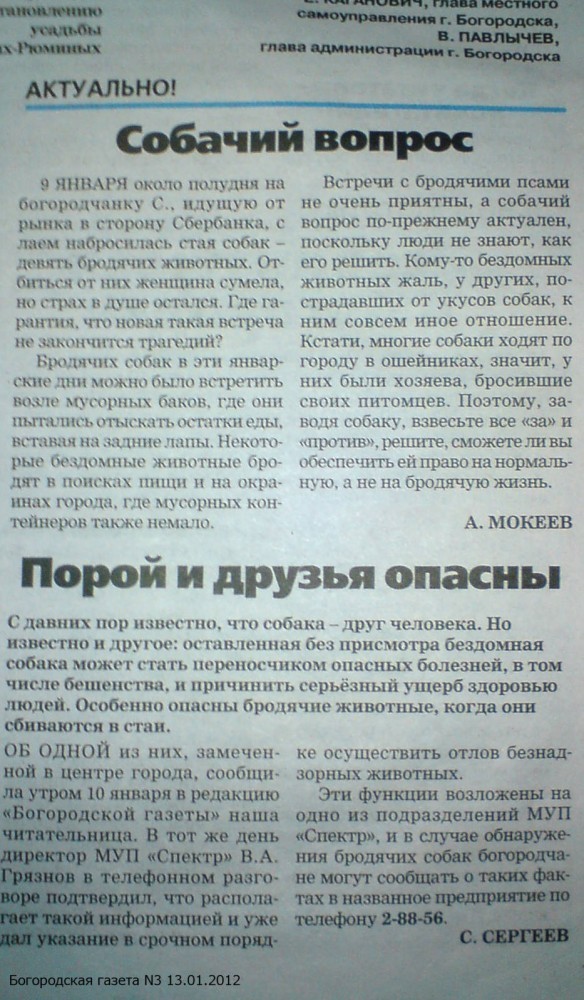 Прошу обсудить отстрел собак в микрорайоне, это негуманно, средь бела дня убивать собак на глазах у всех и выбрасывать их в мусорные контейнеры. Страшно подумать, что отпустив своего любимого Гарика погулять, могу его больше не увидеть, если он решит куда-нибудь метнуться от дома подальше. Кто что думает по этому поводу?
