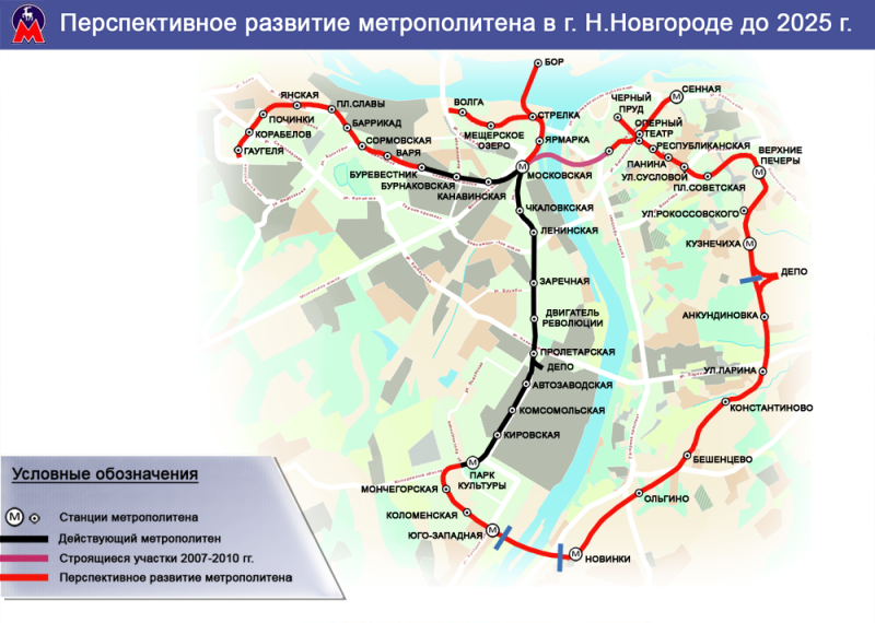 Нижегородский метрополитен предусматривает свое дальнейшее развитие в четырех направлениях: Автозаводское, Сормовское, Мещерское и Горьковское (нагорная часть). Строительство ст. "Горьковская" открывает перспективы дальнейшего развития - строительство ст. "Оперный театр", ст. "Сенная". В планах перспективного развития метрополитена в Нижнем Новгороде до 2025 года предусмотрено продление линии до микрорайона Верхние Печеры и дальше через ст. "Кузнечиха", Анкундиновку, Константиново, Ольгино до Новинок. В районе Новинок предусматривается строительство метромоста для соединения продления Автозаводской линии метро до ст. метро "Юго-западная". ----------