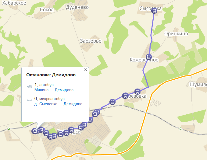 У нас на карте кстати маршрут есть (нужно кликнуть по соответствующей остановке и выбрать номер маршрута). Начинается в Демидово и как раз до Сысоевки.