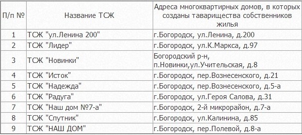 | Список ТСЖ Богородского района. Плата за капремонт от жителей данных домов пойдет на выполнение капремонта. Исключительно на капремонт. Их деньги не пропадут и не будут разворованы к далекому 36 году. Всего девять домов на весь район...