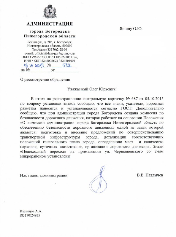 Ответ (отписка) администрации города Богородска, я с данным ответов на счёт того, что дорожные знаки в нашем городе установлены по ГОСТу не согласен, очень много установлены не по ГОСТу. Направил жалобу в Правительство Нижегородской области на администрацию города Богородска!!!