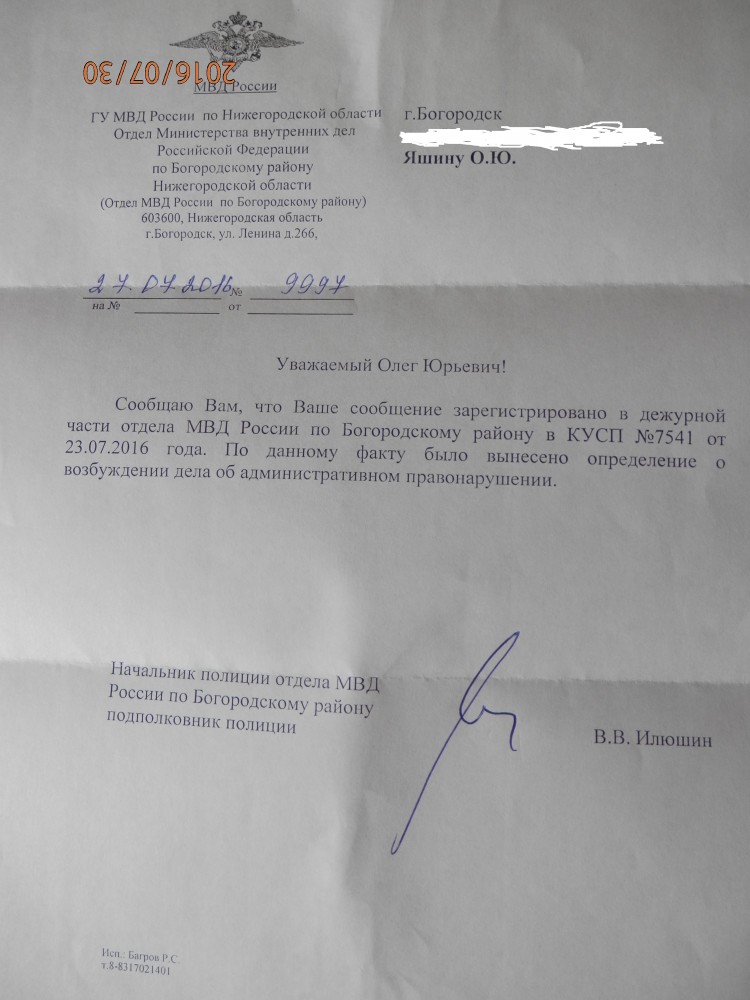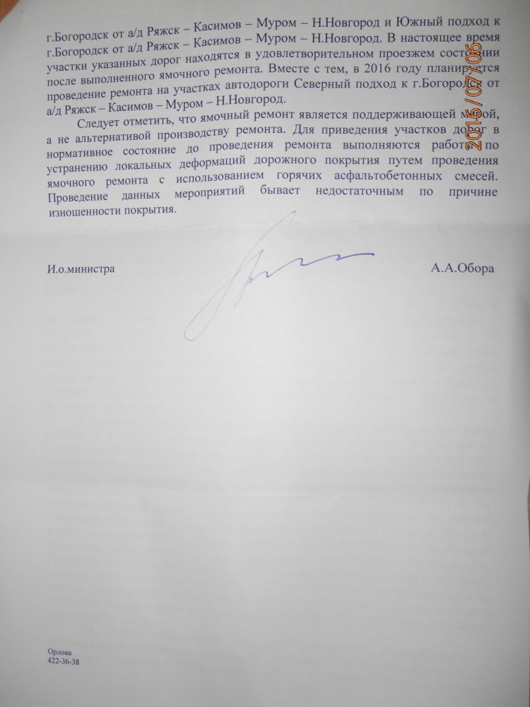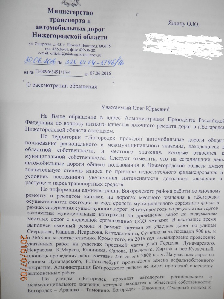 Уважаемый, Начальник ОМВД России по Богородскому району полковник полиции Киселев И. В. прошу Вас согласно письма Минтранс России ( в приложенном файле ) дать указание провести техническую проверку состояние дорог в городе Богородске и районе и при необходимости принять меры согласно ст. 12.34 КоАП. С уважением, Яшин О. Ю. Интересно сотрудники полиции просматривают эту тему ?! Если да, передайте моё обращение. Прикрепленный файл (запретить ямочный ремонт_Яшин_О.PDF, 175.43 Kb, просмотрен: 259 раз) ----------