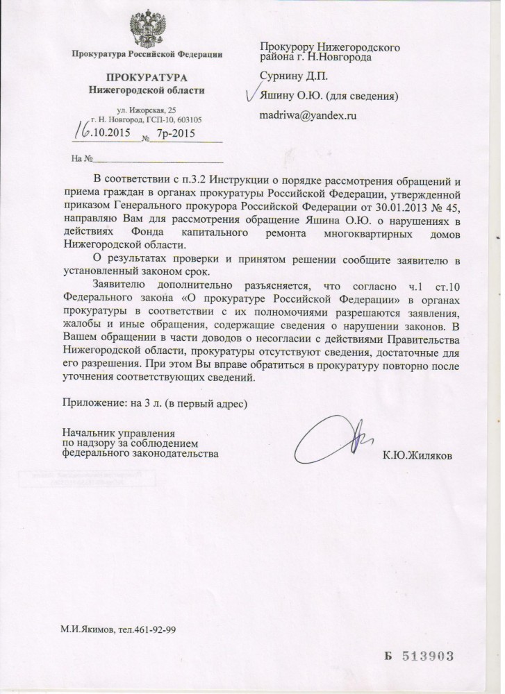 Я, Яшин Олег Юрьевич, зарегистрирован и проживаю: Нижегородская область, город Богородск.................... Прошу Вас принять жалобу на регионального оператора, ответ в приложенном файле. Считаю данный ответ адресованный мне нарушением Жилищного кодекса РФ статьи 181 части 1,2,3, до вступления в силу новой редакции данного кодекса от 29.06.2015 года. В данной редакции Жилищного кодекса РФ было ясно сказано: региональный оператор должен был направить нам договор, после его получения собственниками квартир он считался бы заключённым!!! Договор мы собственники квартир и члены ЖСК № 3, а также председатель ЖСК № 3 не получили до 01.02.2015 года. Оплата на взнос за капитальный ремонт к нам приходит с 01.02.2015 года!!! На каком основание?! если согласно Жилищного кодекса РФ статьи 181 части 2 до вступления в силу новой редакции от 29.06.2015 года: по договору о формировании фонда капитального ремонта и об организации проведения капитального ремонта собственник помещения в многоквартирном доме ежемесячно согласно со статьёй 171 и в полном объёме обязуется вносить на счёт регионального оператора взносы на капитальный ремонт!!! Данный договор направленный им и полученный нами 01.08.2015 года, который был напечатан в квитанциях за коммунальные услуги за июль, на обороте, в данный момент юридическую силу не имеет, после вступления в силу новой редакции Жилищного кодекса РФ от 29.06.2015 года. Согласно вышеизложенному наш ЖСК № 3 платить взнос на капитальный ремонт отказывается, так как региональный оператор ещё и грубо нарушил наши права собственников квартир ЖСК № 3. А именно лишил нас право направить ему протокол разногласий к проекту договора (см. ст. 445 часть 1 Гражданского кодекса РФ), в течение 30 дней со дня получение данного договора, до вступления в силу новой редакции Жилищного кодекса РФ от 29.06.2015 года, который сейчас бы действовал и мы собственники квартир ЖСК № 3 платили бы взнос на капитальный ремонт по договору!!! Статья 445 Гражданского кодекса была указана в Жилищного кодекса РФ, статья 181 часть 1, до вступления в силу новой редакции данного кодекса от 29.06.2015 года. Региональный оператор умышлено "направлял" нам проект договора такими способами, что бы мы его не получили до вступления в силу новой редакции Жилищного кодекса РФ от 29.06.2015 года. Прошу Вас принять меры к региональному оператору согласно законодательство РФ. Примечание для всех: Согласно ответу Богородской прокуратуры от 08.07.2015 года № 1022ж-2015, администрацией Богородского муниципального района 19.11.2014 года было принято постановление № 3342 «О формировании фонда капитального ремонта на счётах регионального оператора». Согласно Жилищного кодекса статьи 181 части 3 до вступления в силу новой редакции данного кодекса от 29.06.2015 года, в течение десяти дней после этого принятия, региональный оператор должен был направить собственникам помещения МКД проект договора или лицам осуществляющим управления этим многоквартирным домом. Куда интересно он данный договор направлял, что мы его не получили?!, да ни кто его не получил в Нижегородской области!!! Копируйте данный текст если считайте что Ваши права нарушили и отправляйте в Генеральную Прокуратуру РФ. Прокуратура Нижегородской области и Богородская городская прокуратура поддерживает Правительство Нижегородской области, а также и регионального оператора. Кому интере