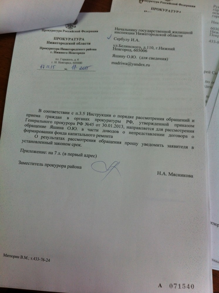 Добрый вечер всем! Отказ Прокуратуры Нижегородской области в моих обращениях, хотя факты нарушения Правительства Нижегородской области мною были предоставлены, но видимо выпущенного Нижегородского закона №159-З от 28 ноября 2013 года (статья 28) Правительством Нижегородской области с нарушением Жилищного кодекса РФ (статья 181) до 29.06.2015 года это для них видимо не факт!