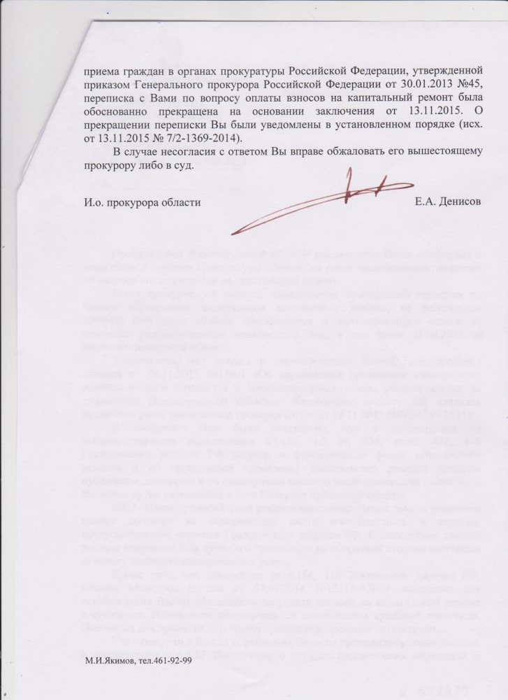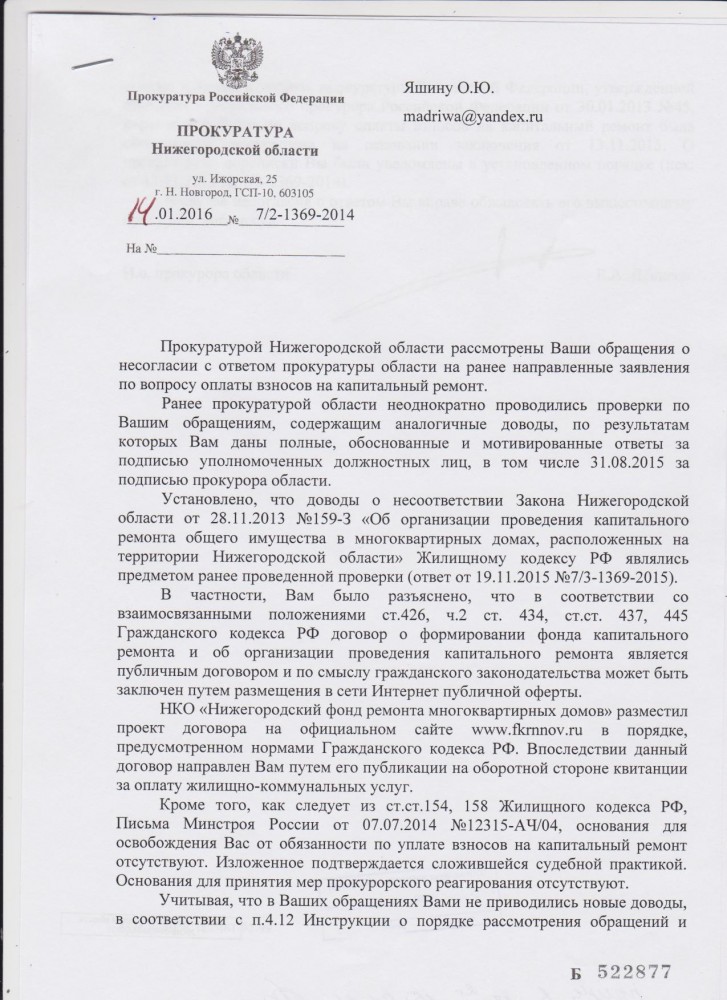 Интересно, Прокурор области вроде Понасенко О.Ю., а мне последний ответ пришёл за подписью И.о. Прокурора области. Наверно в отпуске или в командировке. С которым я тоже не согласен и мною было направлено обращение в Генеральную Прокуратуру РФ. Я, Яшин Олег Юрьевич, зарегистрирован и проживаю по адресу: Нижегородская область, город Богородск............................. Прошу Вас принять жалобу на ответ И.о. Прокурора Нижегородской области от 14.01.2016 года № 7/2-1369-2014 (ответ в приложенном файле). А именно на нарушения наших прав собственников помещения ЖСК № 3 на получения проекта договора о формировании фонда капитального ремонта и об организации проведения капитального ремонта общего имущества в этом многоквартирном доме, до 01.02.2015 года. Данное право было прописано в статье 181 ЖК РФ часть 1 в редакции от 28.12.2013 № 417-ФЗ - при этом уплата собственником помещения в МКД взноса на капитальный ремонт на счёт регионального оператора после получения им проекта такого договора считается его заключением. Проект договора мы должны были получить, но мы его не получили до 01.02.2015 года и не смогли воспользоваться ст. 445 ГК РФ, а именно направить протокол разногласий к проекту договора в течение 30 дней после его получения. Данный проект договора собственники помещений ЖСК № 3 получили его на обороте в квитанциях за оплату жилищно-коммунальных услуги за июль 2015 года, когда договоры уже отменили от 29.06.2015 года. Согласно ответу Богородской прокуратуры от 08.07.2015 года № 1022ж-2015, администрацией Богородского муниципального района 19.11.2014 года было принято постановление № 3342 «О формировании фонда капитального ремонта на счётах регионального оператора». В Жилищном кодексе РФ в редакции до 29.06.2015 года в статье 181 части 3 было прописано именно о направление проекта договора региональным оператором в течение 10 дней собственникам помещения МКД, а не размещать его на своём сайте! Следовательно, проект договора мы должны были получить до 01.02.2015 года. Разместить и направить это разные понятия. А именно о размещение проекта договора на официальном сайте регионального оператора было прописано в статье 28 Нижегородском законе от 28 ноября 2013 года № 159-З с нарушением статьи 181 части 3 Жилищного кодекса РФ в редакции до 29.06.2015 года. Этим Нижегородским законом Правительство Нижегородской области нарушили наши права на получение проекта договора до 01.02.2015 года и следовательно после получение направить региональному оператору протокол разногласий к проекту договора. Проект договора мы собственники помещения данного ЖСК №3 и другие собственники помещений МКД Нижегородской области не получили до 01.02.2015 года, а квитанции за капитальный ремонт нам выставляются с февраля 2015 года. На каком основании ?! Прокуратура Нижегородской области поддерживала и "закрывала глаза" на нарушения Правительство Нижегородской области, которое перевернуло данную статью в своих интересах, нарушив Конституцию РФ ст.2 -Человек, его права и свободы являются высшей ценностью. Признание, соблюдение и защита прав и свобод человека и гражданина - обязанность государства. Платить мы обязаны были за капитальный ремонт по договору согласно статьи 181 части 2 Жилищного кодекса РФ до вступления в силу новой редакции от 29.06.2015 года. Но договор мы не получили до 01.02.2015 года. Прошу Вас принять меры к Прокуратуре Нижегородской об