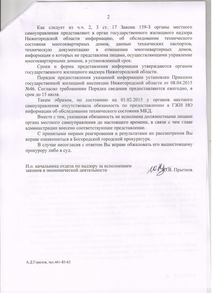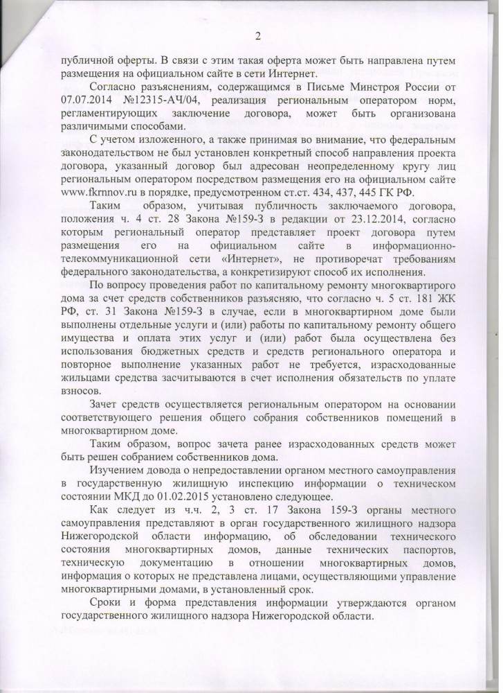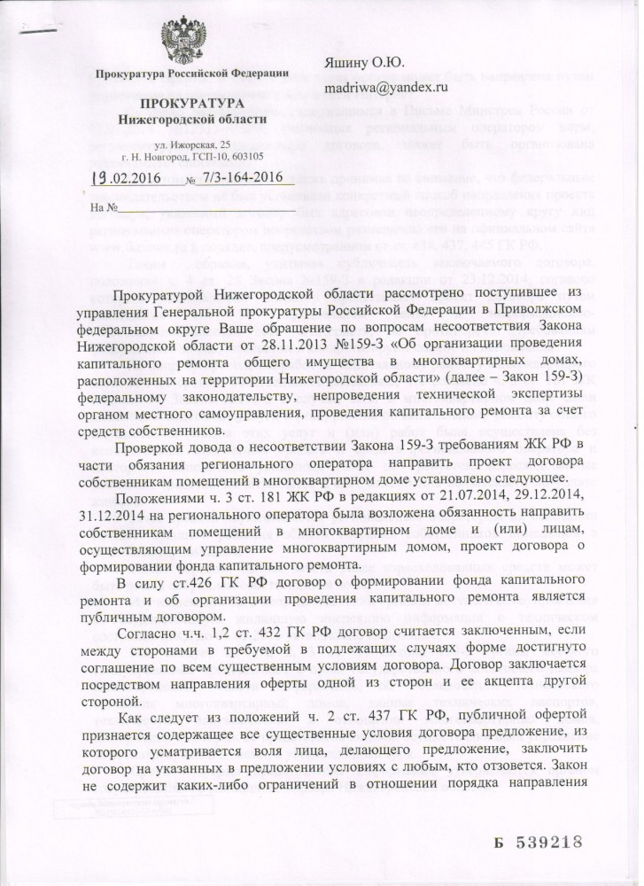 Получил ответ от Управления Генеральной прокуратуры по ПФО. Направил обращение в Генеральную Прокуратуру РФ о не согласии, вот с такой формулировкой !!! Я, Яшин Олег Юрьевич, не согласен с ответом Управления Генеральной Прокуратуры по ПФО от 11.02.2016 года № 32/1-202-2016. Согласно Жилищного кодекса РФ ст.181 части 2 до вступления в силу новой редакции от 29.06.2015 года - по договору о формировании фонда капитального ремонта и об организации проведения капитального ремонта собственник помещения в многоквартирном доме ежемесячно в установленные в соответствии со статьёй 171 настоящего Кодекса сроки и в полном объёме обязуется вносить на счёт регионального оператора взносы на капитальный ремонт. Так что в Жилищном кодексе было ясно прописано, что мы собственники помещения в МКД обязаны были платить взнос на капитальный ремонт по договору. Данный проект договора мы должны были получить. Такое право было прописано в статье 181 ЖК РФ часть 1 в редакции от 28.12.2013 № 417-ФЗ - при этом уплата собственником помещения в МКД взноса на капитальный ремонт на счёт регионального оператора после получения им проекта такого договора считается его заключением. Но мы его не получили до 01.02.2015 года и не смогли воспользоваться ст. 445 ГК РФ, а именно направить протокол разногласий к проекту договора в течение 30 дней после его получения. Данный проект договора собственники помещений ЖСК № 3 получили его на обороте в квитанциях за оплату жилищно-коммунальных услуги за июль 2015 года, когда договоры уже отменили от 29.06.2015 года. Квитанции за капитальный ремонт нам выставляются с февраля 2015 года, без заключения договора. На каком основании ?! А как же Конституция РФ ст.2 -Человек, его права и свободы являются высшей ценностью. Признание, соблюдение и защита прав и свобод человека и гражданина - обязанность государства. Правительство Нижегородской области и региональный оператор нарушили наше право на получения проекта договора до 01.02.2015 года и следовательно направить протокол разногласий к проекту договора. Так же сообщаю Вам, что из ответа управления Генеральной прокуратуры по ПФО на счёт мониторинга технического состояния многоквартирных домов получается недоработка Государственной жилищной инспекции по Нижегородской области. А именно в Законе Нижегородской области от 28.11.2013 года №159-З в статье 17 части 2 и 3 было сказано, что сроки и форма предоставления информации утверждаются органом государственного жилищного надзора Нижегородской области, а оказывается, порядок предоставления указанной информации установлен Государственной жилищной инспекции по Нижегородской области приказом от 08.04.2015 года № 46. Почему так поздно был выпущен данный приказ ?! Значит ст. 17 данного Нижегородского закона была до 08.04.2015 года не действующая. Прошу Вас принять меры и дать мне ответ за подписью Генерального Прокурора РФ. Прикрепленный файл (Ответ Управления Генеральной прокуратуры по ПФО.docx, 715.09 Kb, скачан: 188 раз) ----------