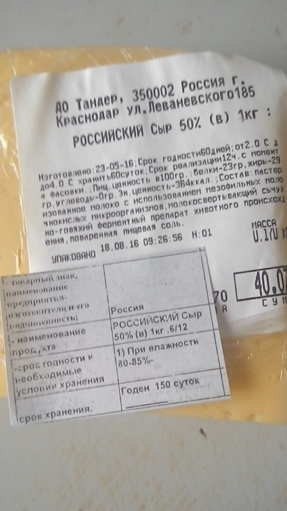 Добрый вечер всем !!! Друзья смотрите на маркировку расфасованных сыров. Сегодня в 3-м микрорайоне в магазине Магнит дата изготовления сыра ноябрь 2015 год, срок годности 60 дней. Просрочка как бы. Но на дополнительной маркировки годен до мая 2016 года. Ляпы магазина !!! Убрали !!!