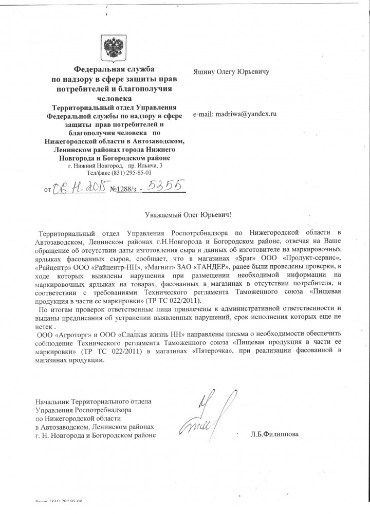Добрый день! Я также занимаюсь и некачественным товаром в продуктовых магазинах Spar, Райцентр, Магнит, Пятёрочка. Обратите внимание все!!!, на маркировку фасованного сыра, который фасуют в данных магазинах заворачивая их в плёнку. Там на маркировке отсутствует дата изготовления сыра!!! Это грубое нарушение прав потребителей!!! Сыр может быть изготовлен например в феврале, а в магазинах расфасован (упакован) в июле. Понимайте о чём я!?