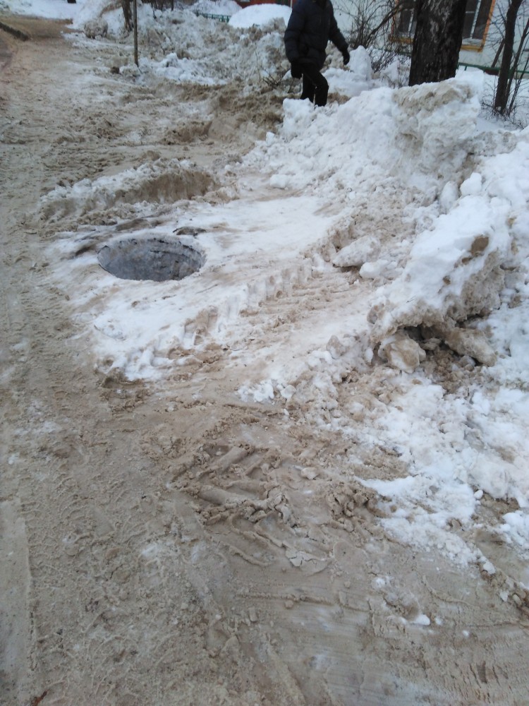 | Утрамбовали снег перед остановкой с обочины, напротив "бухаровского" магазина, вместе со снегом сгребли и крышку люка, люк открытый теперь, если какая-нибудь бабулька угодит, вряд ли оправится.