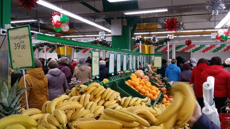 | Были вечером,народу тьма,очень узкие проходы, если идут две мамочки с колясками, пройти не возможно. В зале присутствует небольшой запах краски. Цены многие выше,чем во всех магазинах. Привлекают бананами по 39 р, но это ненадолго,скоро все поднимут.
