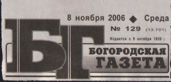 " Богородская газета" - очень сухо и прозаично звучит. Никакой романтики и вдохновения. А чем не устраивало название "Ленинская Победа"? Поспешили перекраситься. Так ведь после каждых выборов название можно менять. "Комсомольская Правда" и "Ленинская Смена" имя сохранили и не жалеют об этом. Кстати, многие читатели продолжают называть её по-старому. А содержание соответствует уровню "Боевого листка" воинской части с небольшими дополнениями. Очень жаль, что в городе нет конкурентов у этого издания.
