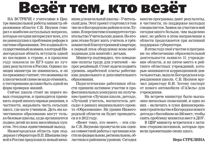| Тут статья в газете. "Везёт тем, кто везёт". Написала ее Вера Стрелина. Статья про то, как министр образования областной приезжал в ЦВР, наши официальные лица тоже там были, о многом говорили и так далее. Статью прилагаю, почитаете, если интересно. Но мне в ней интересным показался ровно один момент: