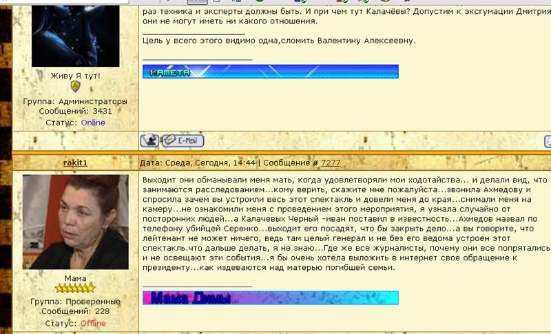 Мама Группа: Проверенные Сообщений: 230 Репутация: 7 ± Замечания: 0% Статус: Online Всем,всем...сигнал СОС...Сегодня на кладбище был разыгран спектакль...в гл. роли Черный -иван, собрались как бы делать эусгумацию...загородили могилу железными листами, не было техники и людей, которые могли делать эксгумацию, крана, что бы убрать стеллу, но были там оба Калачевых, которые обзывали меня всякими словами ....и даже с словами и руками сделали мне непристойное предложение на тебе.......й, меня снимали на камеру Черный-иван на мои слезы и вопли, что вы устроили этот спектакль, где постановление суда на проведение эксгумации, он ответил, что у Калачевой...где профессор Щербаков и остальные, которые должны присутствовать при этом...и все мои слезы и вопли снимались на камеру, я хотела умереть в этот момент...не было сил...одни терзания и мысли издевательства над матерью...врачи натыкали уколы...теперь я знаю, кто такой Ахмедов... |