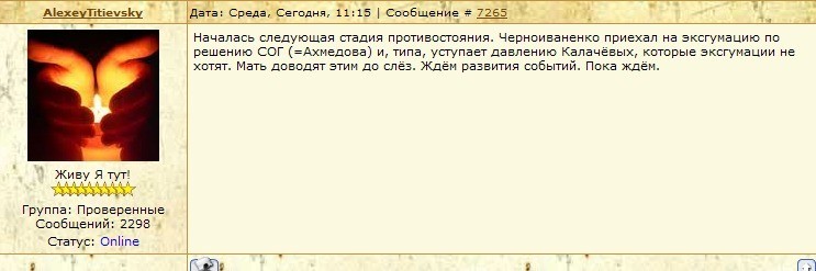 | Rem написал: никто не может знать таких подробностей о которых она пишет Да что ты говоришь? Ну вот тебе, Алик, пример. Сегодняшний. Очень показательно, кто и что может знать то, что знает В.А. Ты только не делай вид, что не заметил, прокомментируй этот мой пост. Итак! Сначала(смотрите на время поста) появляется на сайте Кабака сегодня вот этот пост от русофоба и украинского эмигранта Титиевского, лучшего друга Чудаковой, которому она даже фотографии боевых товарищей Дмитрия с открытыми лицами слила. AlexeyTitievsky Дата: Среда, Сегодня, 11:15 | Сообщение # 7265 Началась следующая стадия противостояния. Черноиваненко приехал на эксгумацию по решению СОГ (=Ахмедова) и, типа, уступает давлению Калачёвых, которые эксгумации не хотят. Мать доводят этим до слёз. Ждём развития событий. Пока ждём. Чуть позже появляется пост от В.А. rakit1 Дата: Среда, Сегодня, 12:39 | Сообщение # 7272 Всем,всем...сигнал СОС...Сегодня на кладбище был разыгран спектакль...в гл. роли Черный -иван, собрались как бы делать эусгумацию... --- Отсюда: http://zakonporusski.ucoz.ru/forum/2-37-291 Не могу вставить скрин, поэтому ссылки. Скрины есть, если что. И как это назвать? |