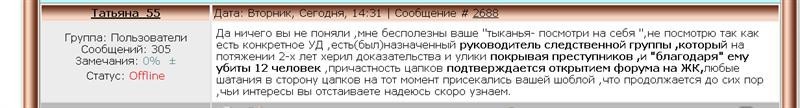 | Цитата: Я в шоке!!! Что Вам здесь нужно? К чему все эти пустые разборки. Зачем Вы здесь на этом сайте? Здесь земляки погибших. Друзья Ирины и Дмитрия. Одноклассники Веронички. Мы все скорбим и помним их. Все хотят, чтоб наказали действительно убийц. Селена, Вы о чем? Что конкретно Вы сделали для того, чтобы были найдены настоящие убийцы? Вы все-знакомые Чудаковых, сослуживцы, коллеги по работе дружно молчите и ждете, когда же засадят невиновного парня. Люди со всей страны поддерживают Валентину Алексеевну, даже не зная ее и никогда не видевшие НИКОГО из семьи Чудаковых! Люди писали письма во все инстанции, от газет до президента и премьера, люди присылали ей помщь со всей страны по 200-500 рублей, потому что очень многих задело ее горе и бездействие следствия, мало того фальсификацию уголовного дела. Что Вы сделали, я спрашиваю? Как смеете Вы говорить нам, защитникам Матери -зачем вы сюда пришли? Мы пришли ее защитить-первым начал писать здесь Ферапонт из лагеря обвинения. И начал писать конкретные гнусности. Что конкретно Вы знаете об этом деле? НИЧЕГО! Стыдно! |