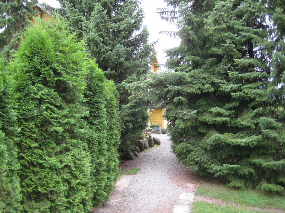 | Дорожка среди туи и ёлок.