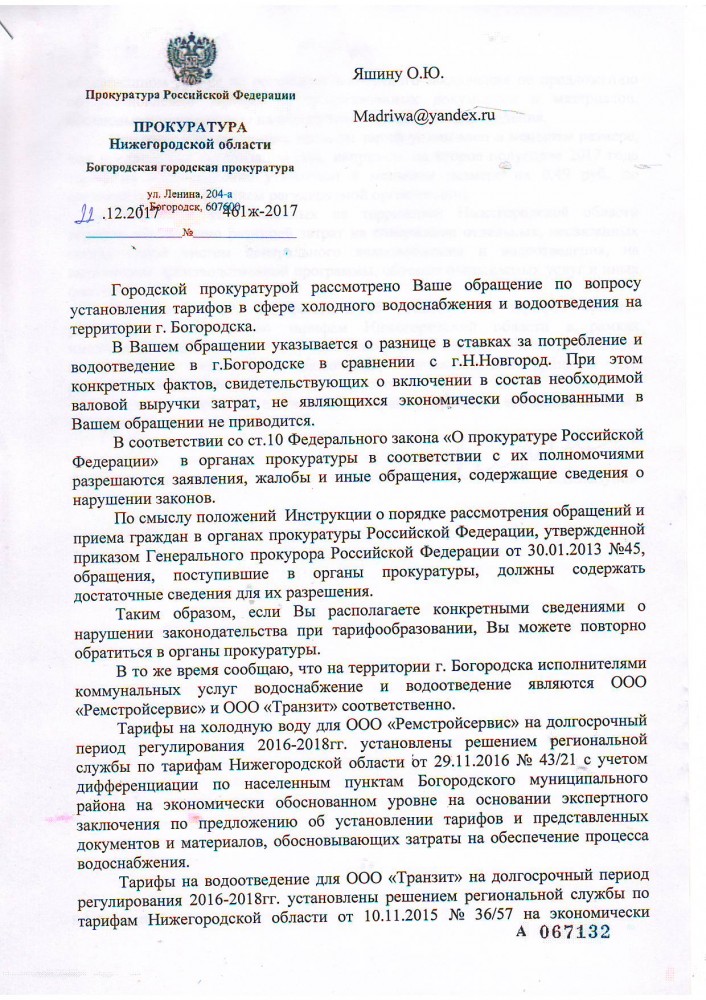 JOKER 1 написал: Я думал у меня одного проблема с водой. Фильтры поменял. Ничего не изменилось. В Хабарском мощная фильтровальная станция. Туда даже депутатов на экскурсию возили. Денег израсходовано немерено на реконструкцию. Так вот давай жители города Богородска и района направляйте обращения в прокуратуру Нижегородской области прикладывайте мой ответ Богородского городского прокурора и требуйте провести проверку тарифного законодательства в городе Богородске !!! Наша городская прокуратура так и не дала мне конкретный ответ: нарушен данный закон или нет. ----------