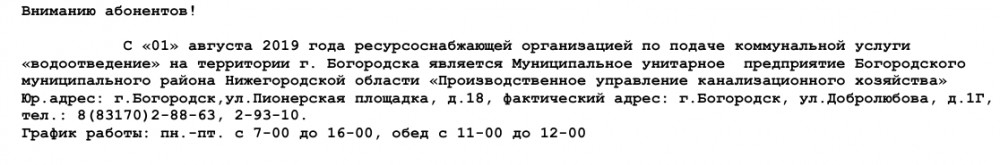 В Сбербанке на ул.Ленина мне в феврале помогли подключить автоплатёж за воду-вот реквизиты: Получатель Наименование: Богородский водоканал Услуга: ВОДОСНАБЖЕНИЕ ИНН: 5245018406 Счет: 40702810100000001236 Банк получателя Наименование: 30101810700000000759 БИК: 042206759 Корсчет: Богородский водоканал Плательщик ----------
