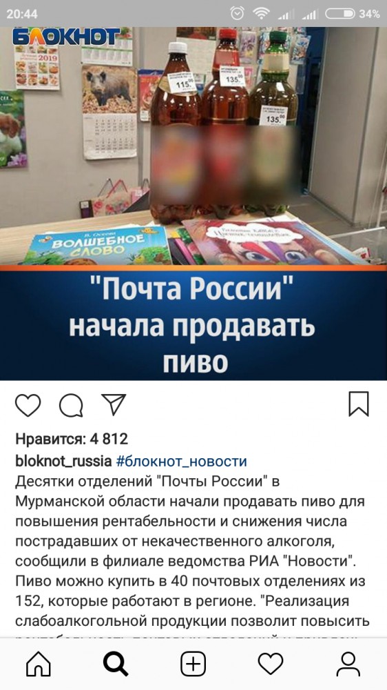| bogest написал: Ждём гипермаркет почта Официальный представитель Почты России объяснил ,что таким способом они борются с некачественным алкоголем. Якобы на Почте продают только качественный и проверенный алкоголь. |