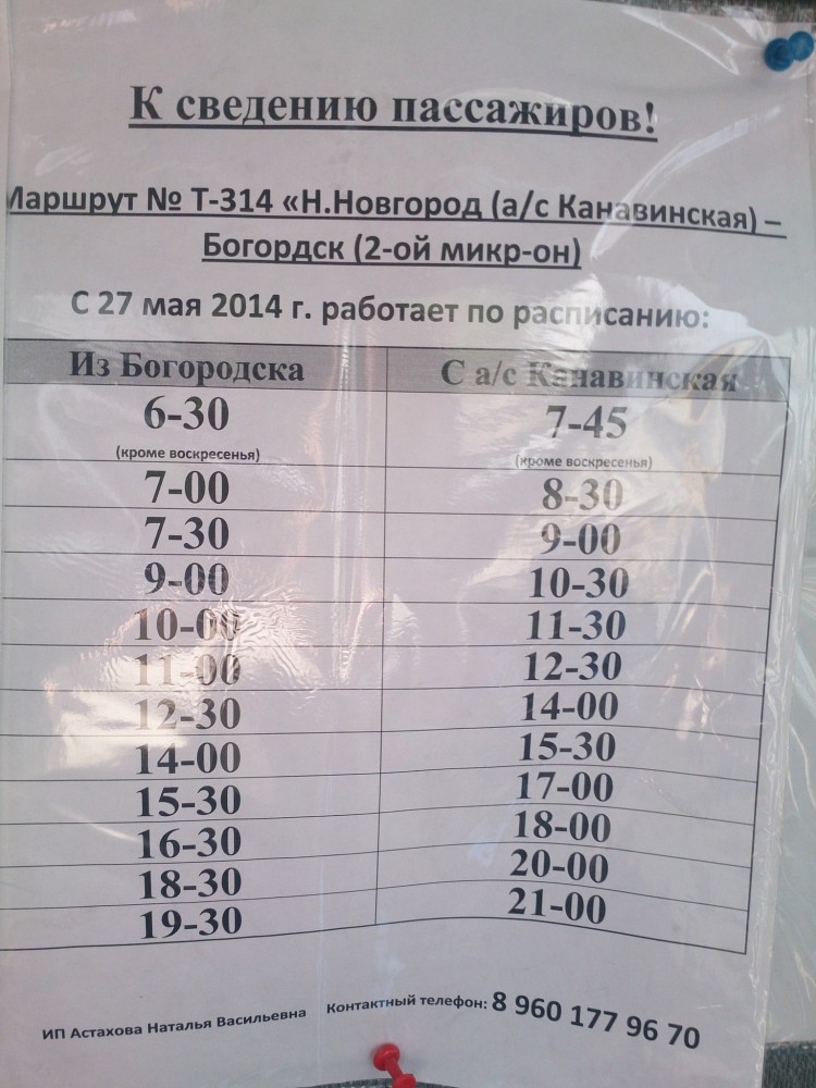 перевозчику маршрута №314: ИП Данилова Л.А. Лицензия №032239 от 18.03.2005 Контролирующая организация: УГАДН 88317131685 Министерство транспорта и автомобильных дорог Нижегородской обл. 4223645 Договор обязательного страхования гражданской ответственности перевозчика SOGX2 №1411442548000 действует с 27.03.2014 по 27.03.2015 со СК "Согласие" адрес: 603000 г.Н.Новгород ул.Короленко,27 тел.:430-41-60; 433-04-61; 430-3-52 информация взята со стекла водителя ПАЗика №314)) |