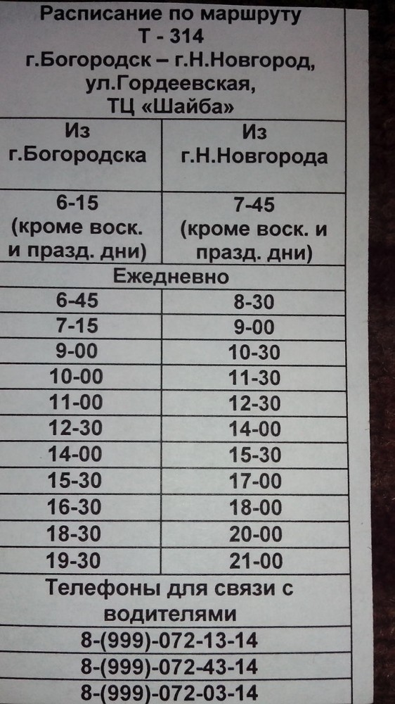 314 маршрут Богородск — ул.Гордеевская (ТЦ "Шайба") Актуальное расписание маршрута (обновлено 07.07.2025) ![]()