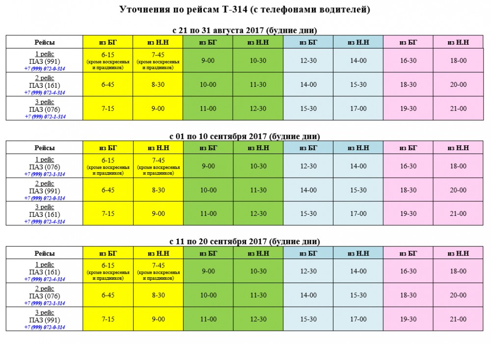 Мне кажется в нём есть неточность, относительно рейсов автобусов. Расписание было взято давным-давно у водителей, возможно, ошибка с тех пор... Раньше эта неточность не играла никакой роли, т.к. не были прикреплены телефоны и номера автобусов, а теперь это важно. Сейчас в таблице написано так: автобус, который выезжает из НН в 17-00, потом выезжает из БГ в 18-30; Скорее всего, тут ошибка ![]() По логике должно быть так: 2-й рейс - из НН отправление в 15-30, из БГ - в 18-30; 3-й рейс - из НН отправление в 17-00, из БГ - в 19-30 Гоша, посмотрите, пожалуйста, ещё раз, дабы исправить все неточности |