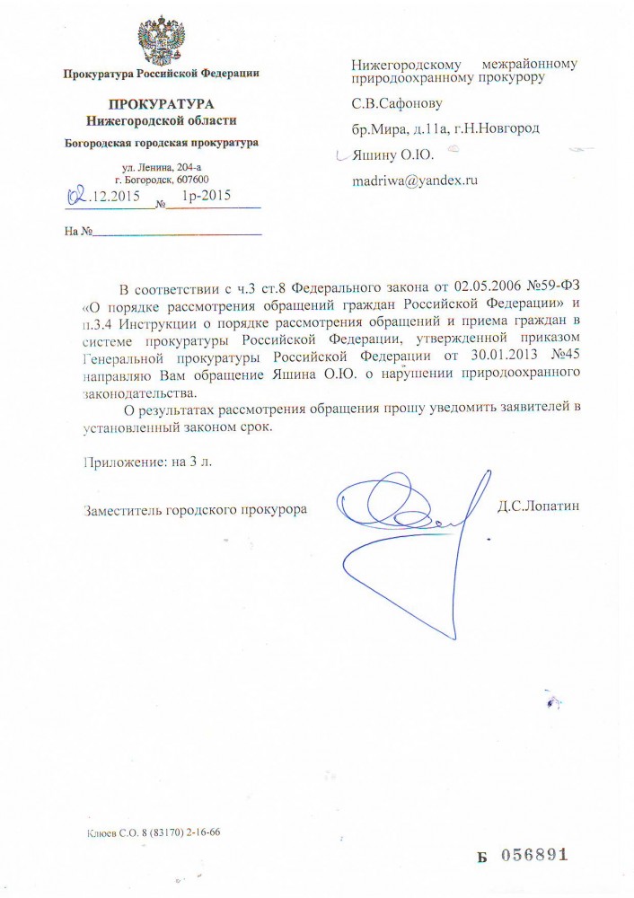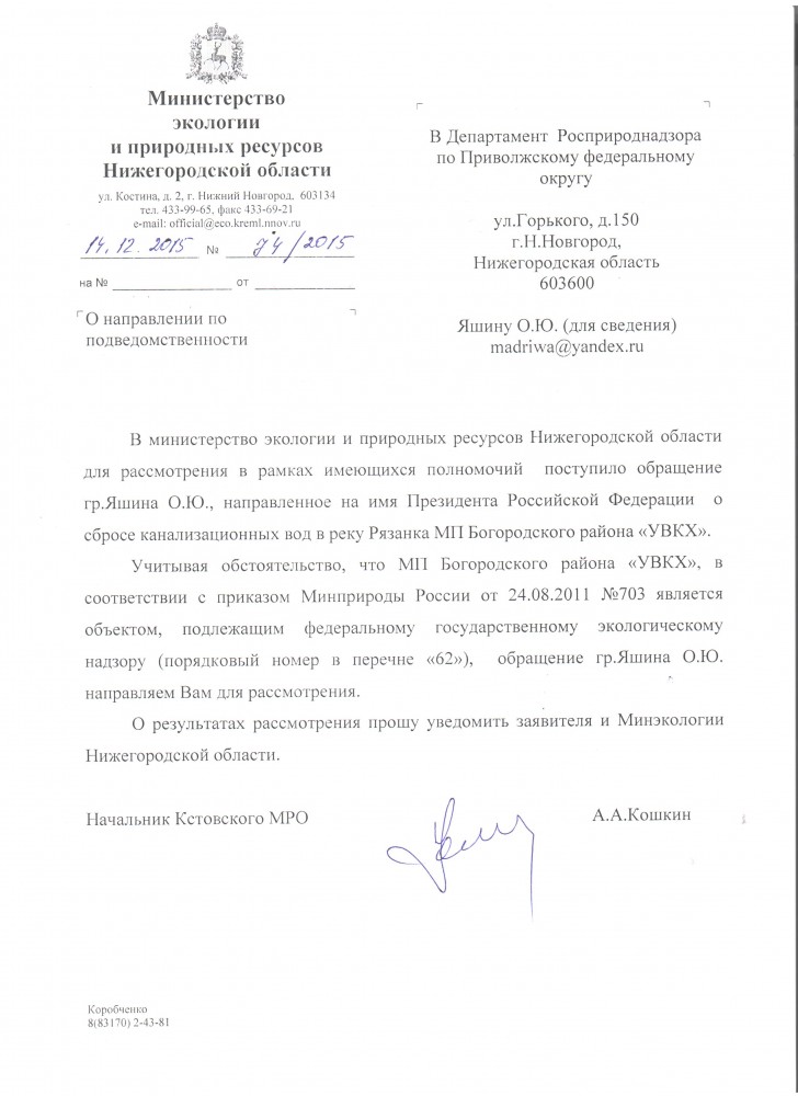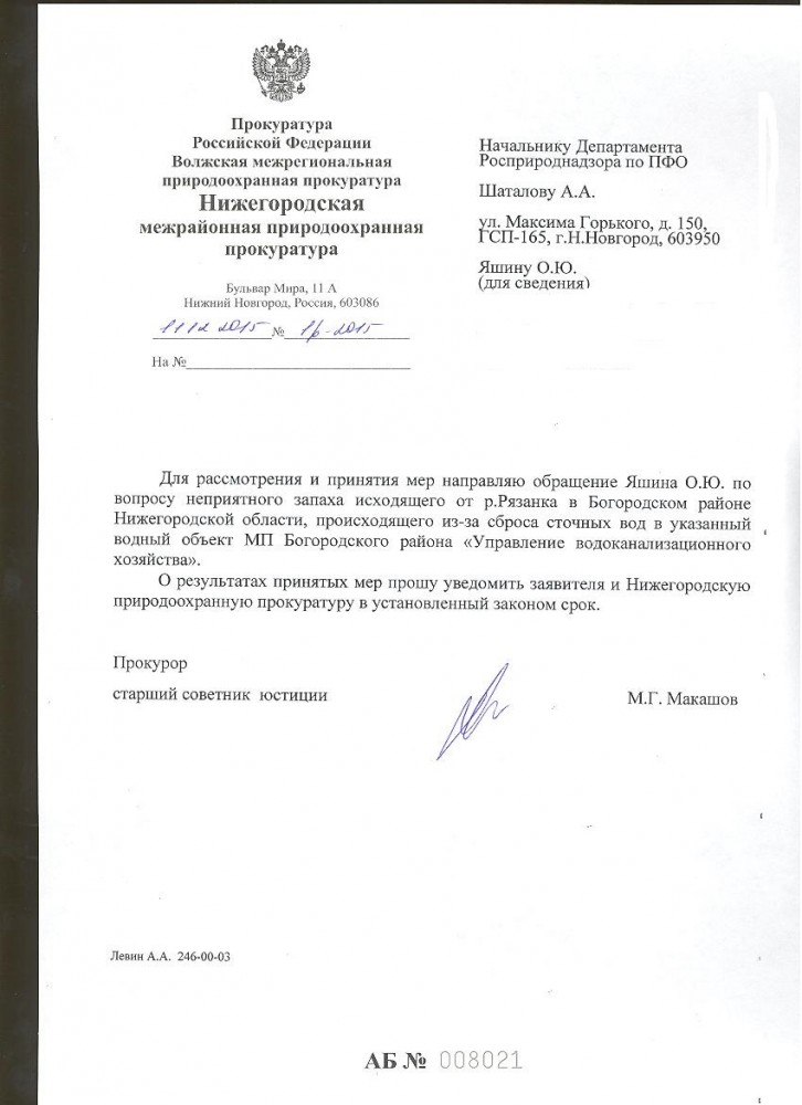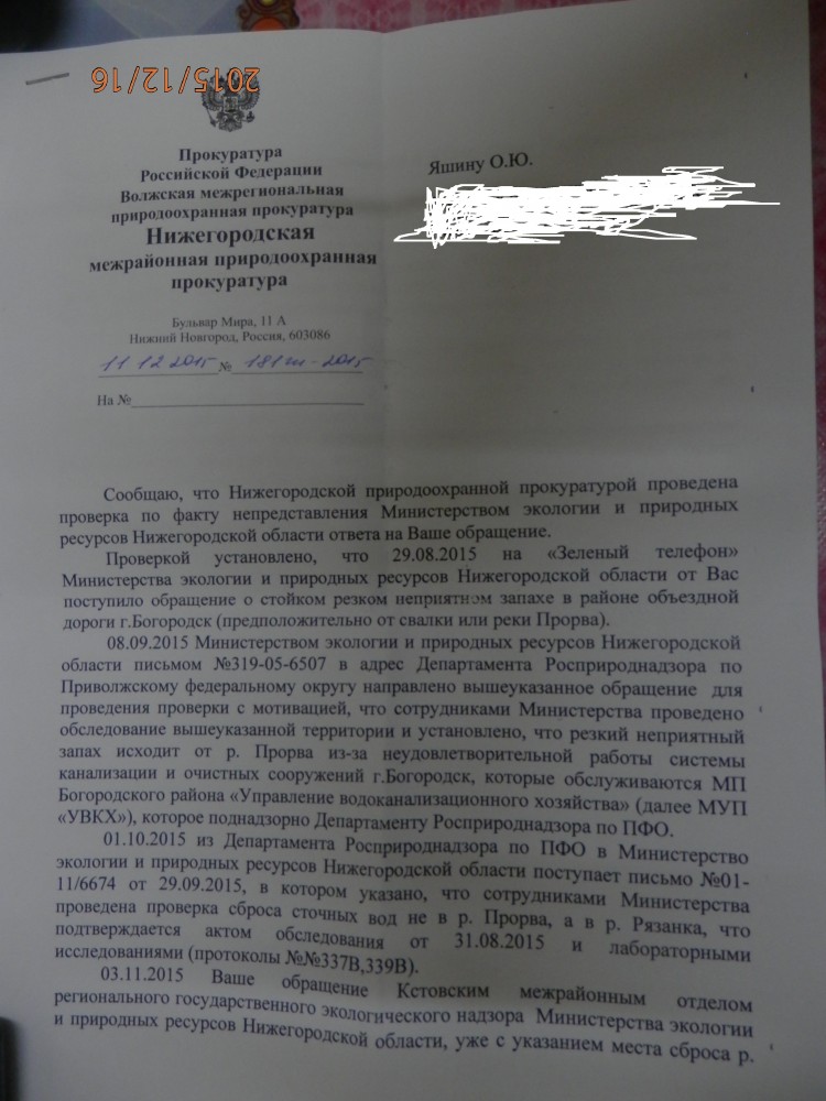 Добрый вечер всем! Вот такое обращение было направлено мное в Следственное управление по Нижегородской области: Я, Яшин Олег Юрьевич, прошу Вас провести следственную проверку МП Богородского района " Управление водоканализационного хозяйства" на счёт экологического правонарушения, а именно наличие резкого неприятного запаха, который исходит от реки Рязанка, Нижегородская область, объездная города Богородска, 419-420 км Павлово-Н. Новгород, из-за сброса канализационных вод в данную реку. Ответ Министерство экологии Нижегородский области в приложенном файле.