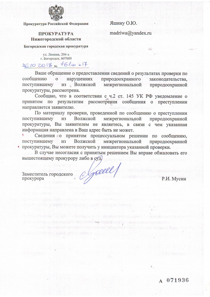 Добрый вечер всем. Как же я не являюсь заявителем ?! Если я направлял обращение, чтобы природоохранная прокуратура провела проверку загрязнения р. Рязанка в городе Богородске Нижегородской области и просил чтобы приняли меры для возбуждения уголовного дела.