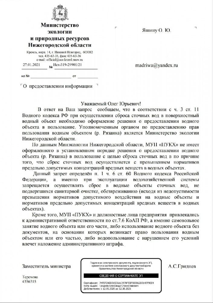 Добрый день всем. Согласно ответа Министерство экологии и природных ресурсов Нижегородской области у МУП "ПУКХ" досих пор отсутствует разрешение использовать р. Рязанка для сброса сточных вод. Также разрешения небыло и у ООО "Транзит". Вот так у нас законодательство построено: организация может заниматься водоотведением, сбрасывать сточные воды в водный объект не имея на это разрешения использовать для этого водный объект.