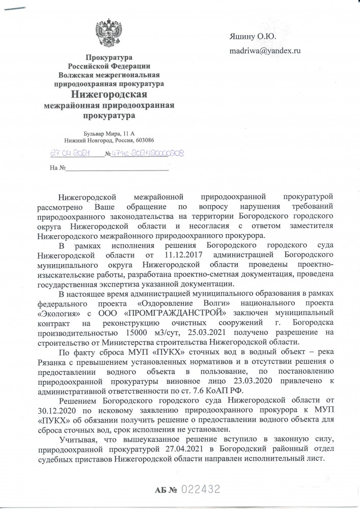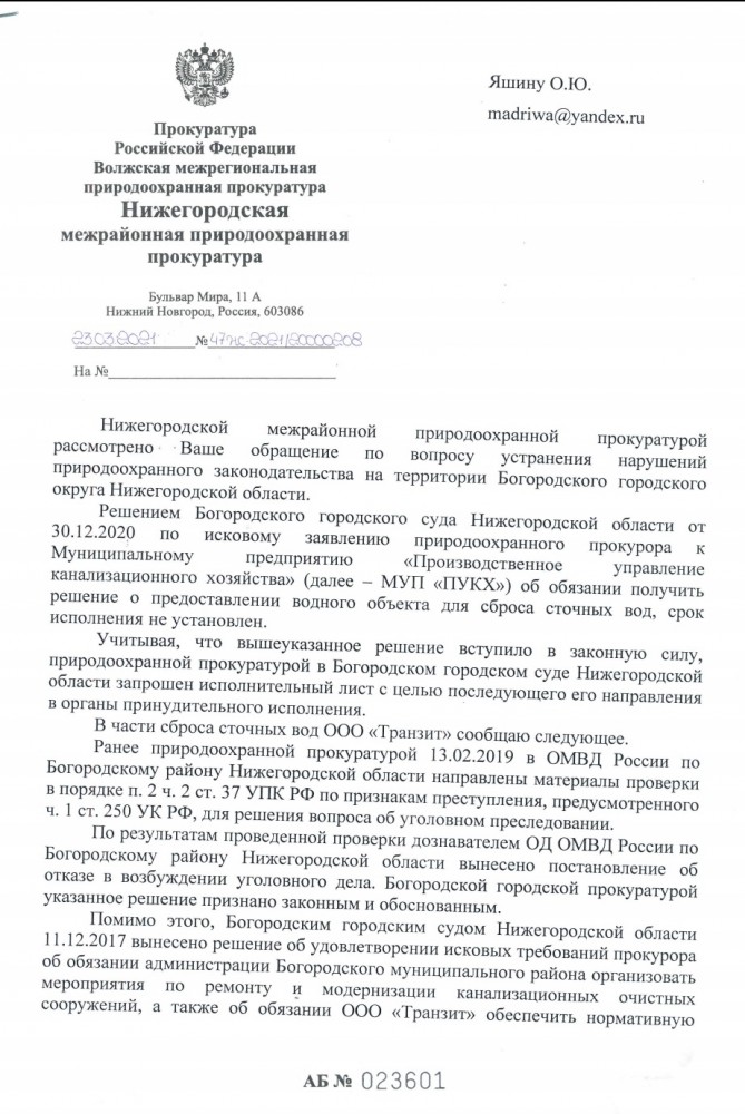 Добрый день всем. Ответ Волжской межрегиональной природоохранной прокуратуры. Продолжаю следить за движением дела. Жители города Богородска, кто если не мы будем это делать.