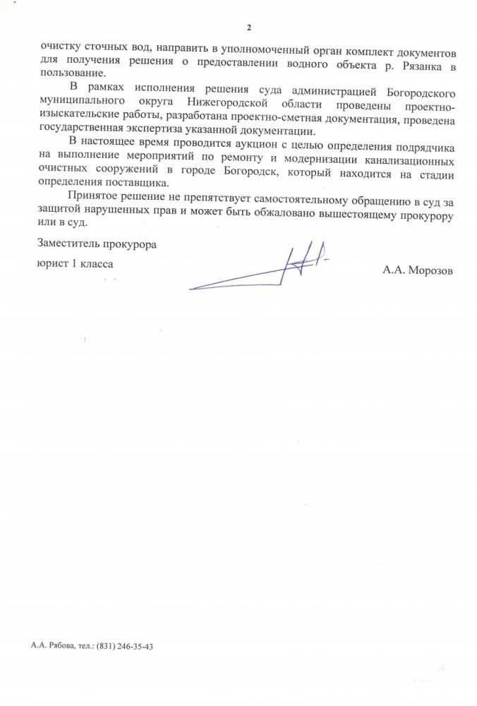 Мною было направлено дополнительное обращение в межрайонную природоохранную прокуратуру на счёт получения информации срока получения разрешения МУП "ПУКХ" на сброс сточных вод в р. Рязанка. Интересный ответ получил, оказывается срока исполнения нет. Судебное решение вступило в законную силу, а значит МУП "ПУКХ" обязано было принять меры чтобы получить разрешение на сброс сточных вод в р. Рязанка. Но у них его так и нет следуя из последнего ответа Министерство экологии и природных ресурсов Нижегородской области. Да ещё интересный факт оказывается поставщик, кто будет выполнять реконструкцию очистных сооружений ещё не выбран, но работы с целью определения подрядчика ведутся это уже хорошо.
