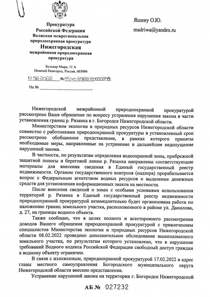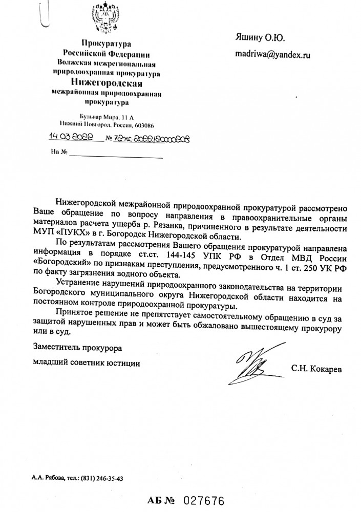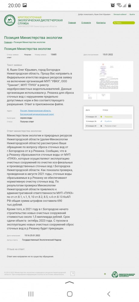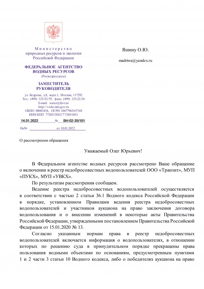 Добрый день всем. Интересно узнать позицию Министерства экологии и природных ресурсов Нижегородской области по этому поводу, направил обращение: Я, Яшин Олег Юрьевич, город Богородск Нижегородская область. Прошу Вас направить в Федеральное агентство водных ресурсов заявку на включение организаций МУП "УВКХ", ООО "Транзит", МУП "ПУКХ" в реестр недобросовестных водопользователей. Данные организации использовали р. Рязанка для сброса сточных вод с нарушением предельно допустимых норм и без соответствующего разрешения. Ответ в приложенном файле.