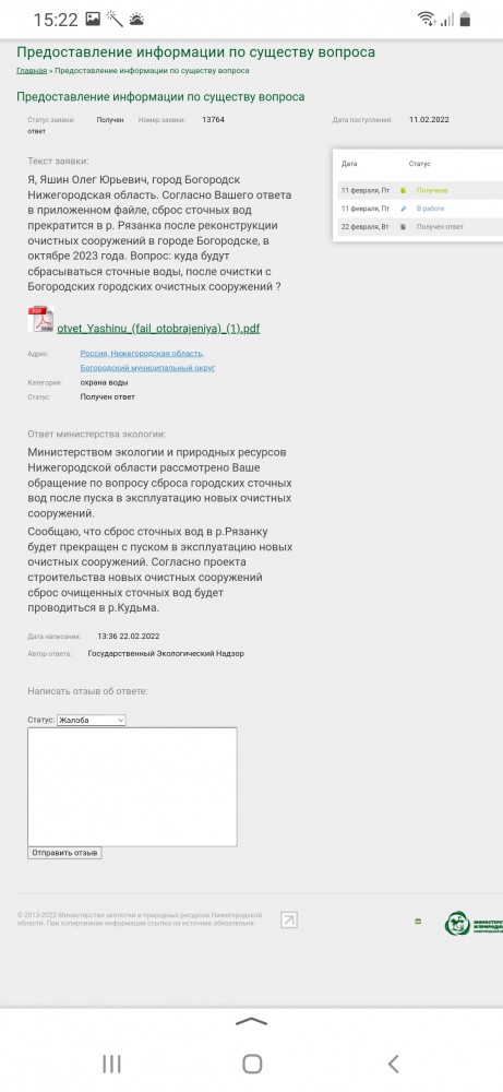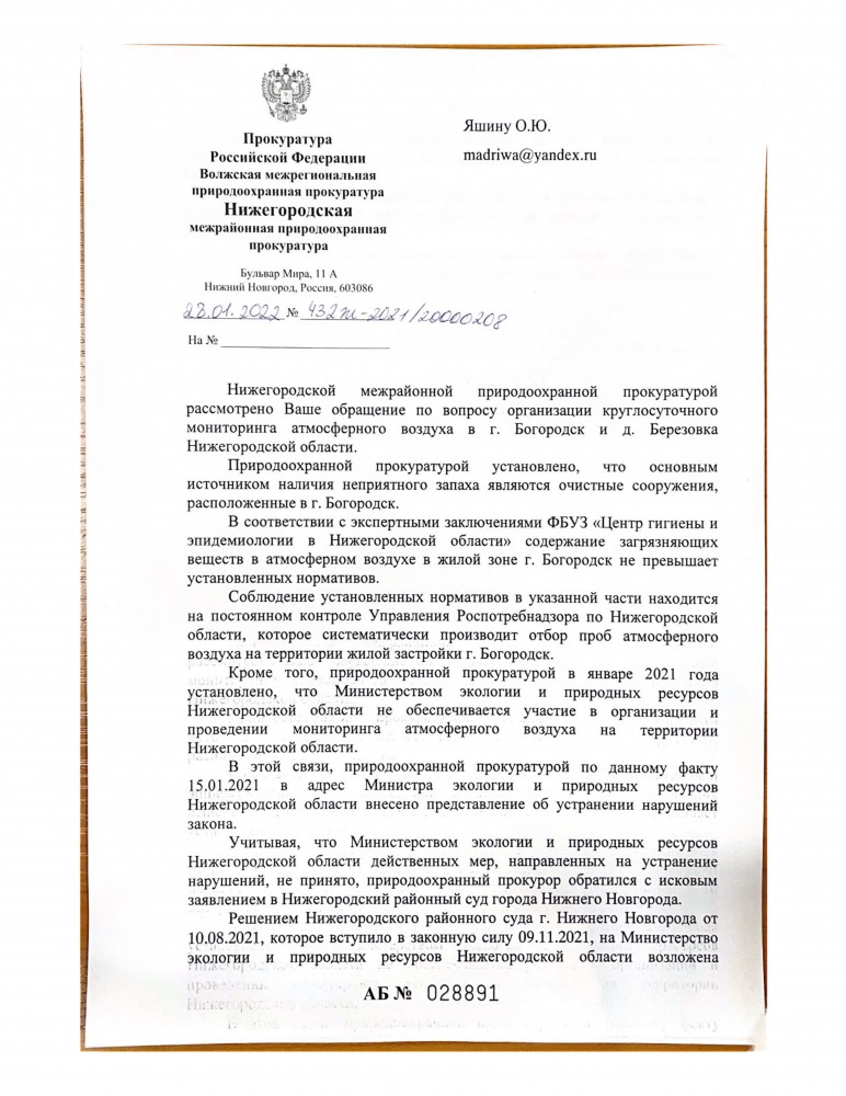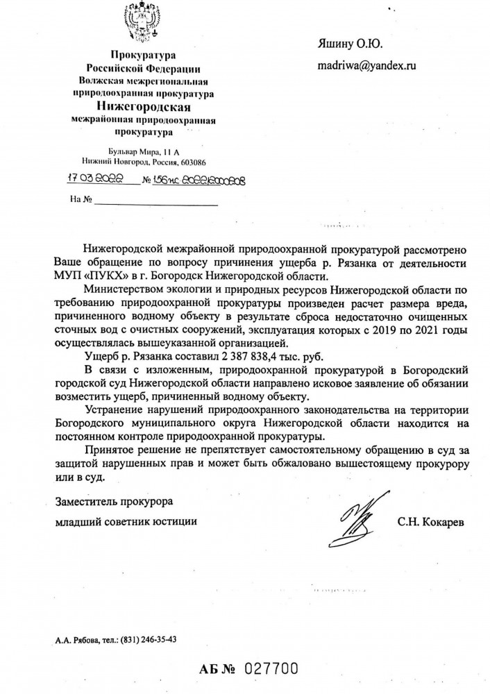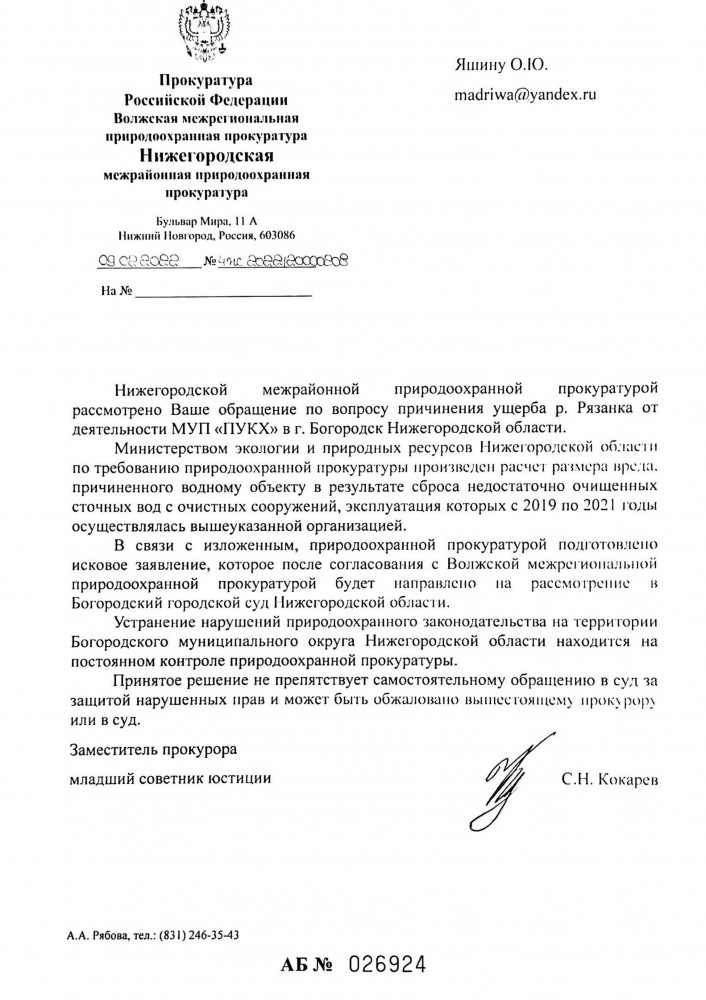 Добрый вечер всем. Жители города Богородска и района я не знаю, что "курят" Министерства экологии и природных ресурсов Нижегородской области. Прошу предоставить одну информацию, ответ вообще не по существу обращения. Видимо пока не хотят упоминать МУП "УВКХ" и их нарушения. Давайте исправляйтесь или мною будет направлено обращение в природоохранную прокуратуру.