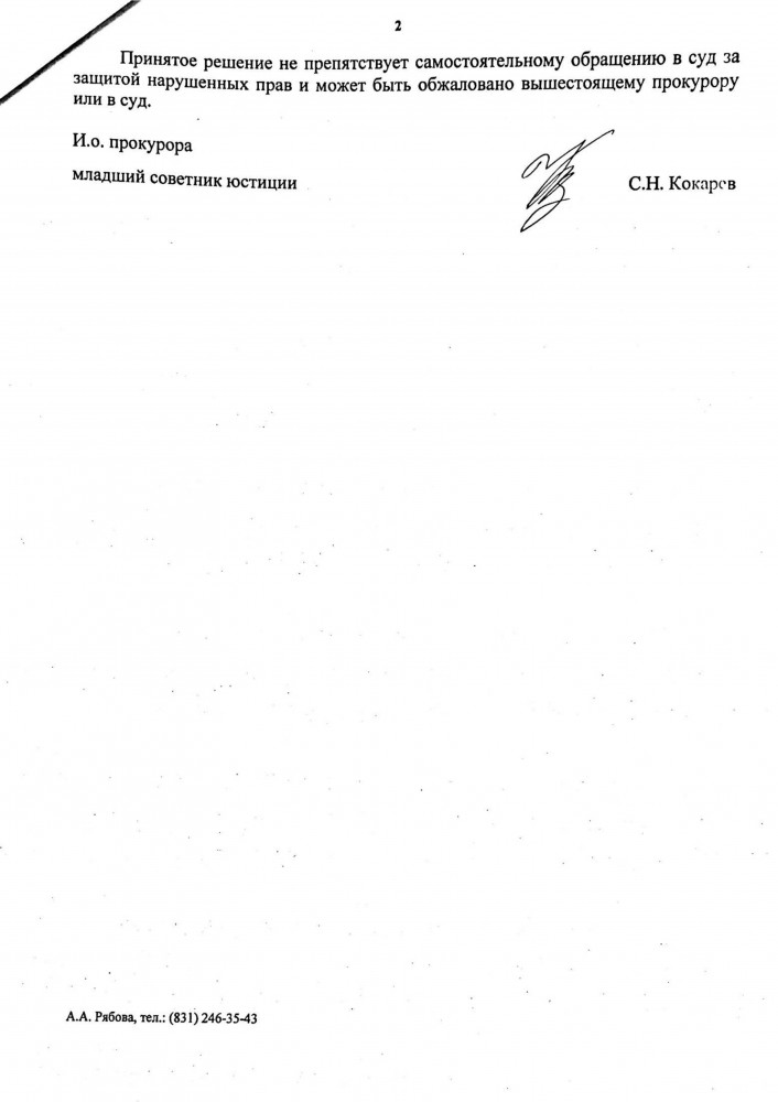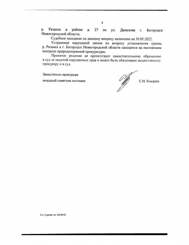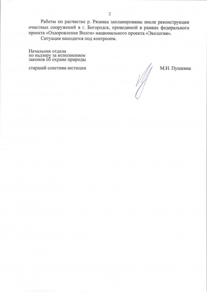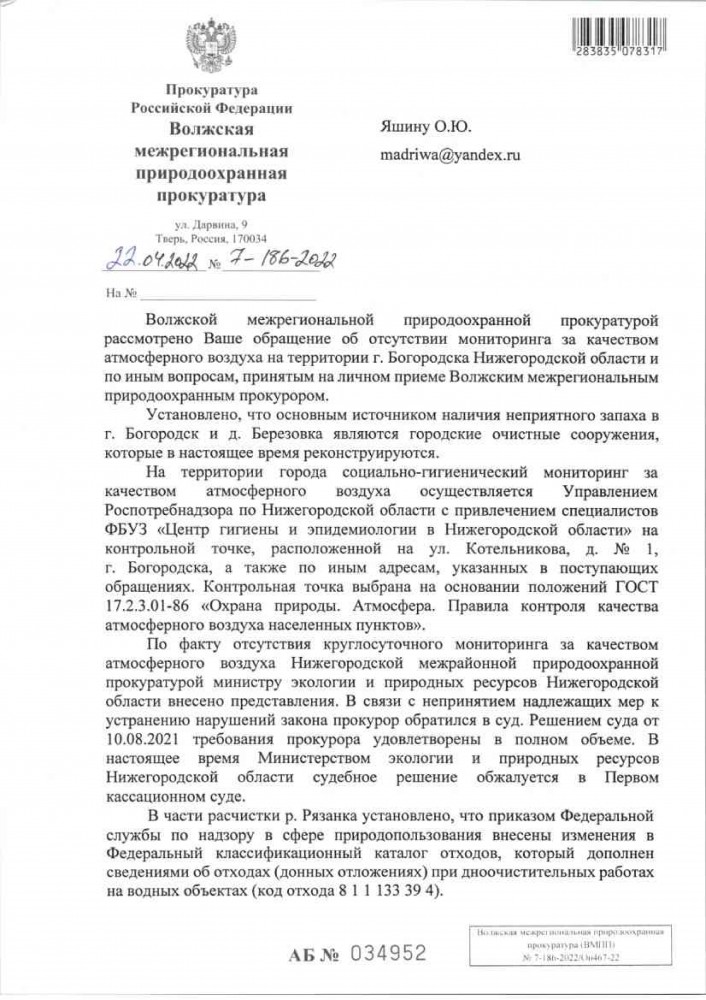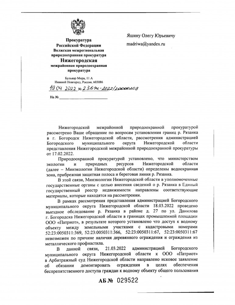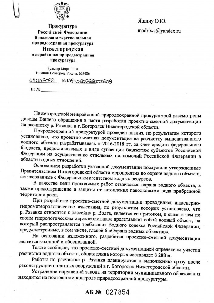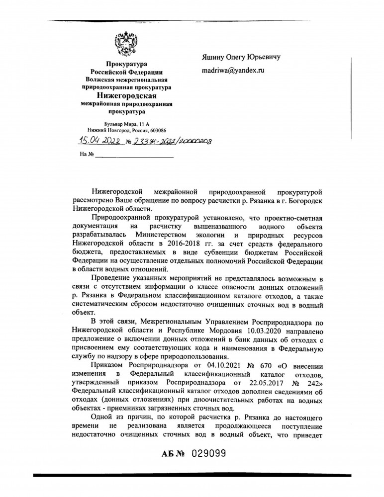 Добрый вечер всем. Хитро уходит от ответа по существу поставленного вопроса прокуратура. Направил о несогласии. Я, Яшин Олег Юрьевич, город Богородск Нижегородская область, не согласен с ответом И.о. межрайонного природоохранного прокурора Кокарева С.Н., ответ в приложенном файле. Так как ответ мне дан не по существу поставленного вопроса. Я просил: Я, Яшин Олег Юрьевич, город Богородск Нижегородская область сообщаю Вам, что есть проектно-сметная документация на расчистку р. Рязанка. Прошу Вас провести прокурорскую проверку и предоставить мне достверную информацию, как могли спроектировать и согласовать эту документацию если р. Рязанка не стояла на государственном кадастровом учёте ? Считаю это факт халатности. Также сообщаю Вам, что расчистка р. Рязанки должна быть от истока, исток сейчас в районе Богородской обувной фабрики, там два родника, прошу Вас учесть мое мнение. Прошу Волжскую межрегиональную природоохранную прокуратуру провести служебную проверку и направить мне ответ по существу поставленного вопроса.
