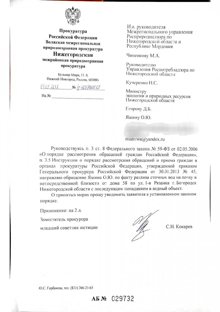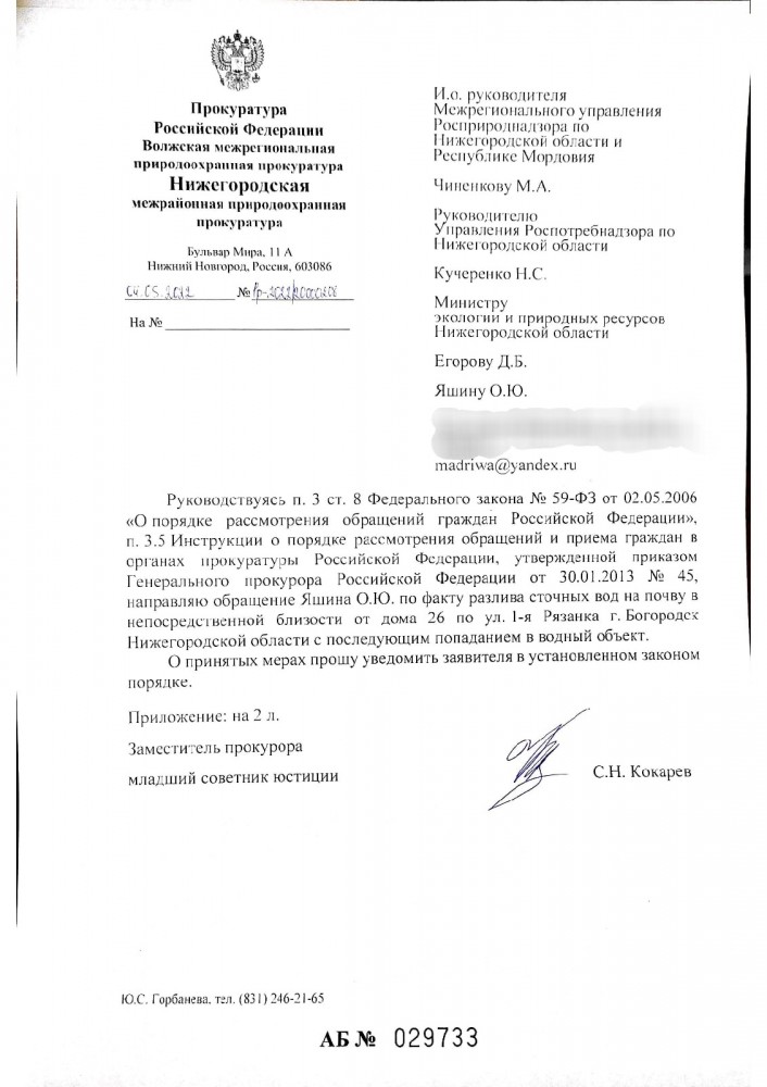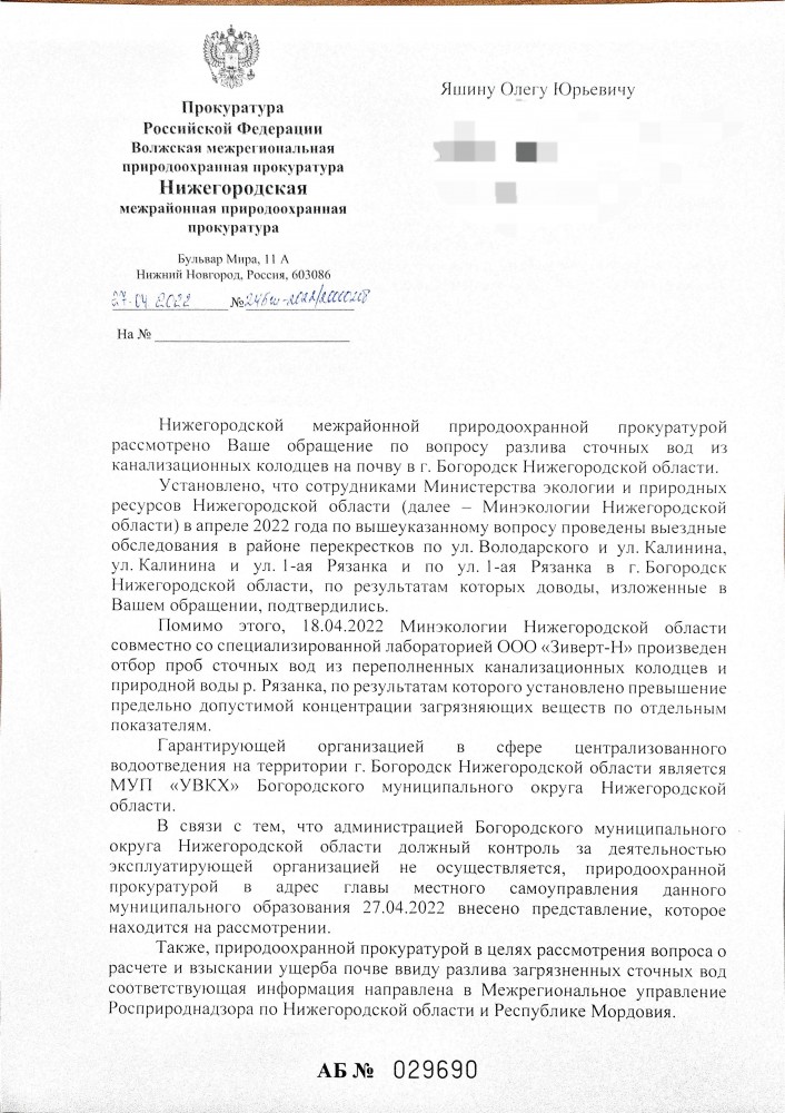 Я, Яшин Олег Юрьевич, город Богородск Нижегородская область. Не согласен с ответом заместителя Нижегородского межрайонного природоохранного прокурора, ответ в приложенном файле. А именно, в обращение я писал и говорил на видео не только о разливе сточных вод на почву, но и главное о том что сточные воды из канализационных колодцев напрямую текут в р. Рязанка в районе обувной фабрики. В районе обувной фабрики исток речки Рязанка !!! Там два родника !!!