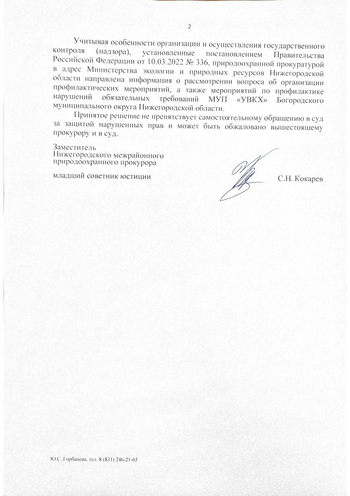 Министерством экологии и природных ресурсов Нижегородской области рассмотрено Ваше обращение по вопросу разлива (перетекания) сточных вод из переполненного канализационного колодца в р. Рязанка г. Богородска Нижегородской области. Сотрудниками Минэкологии Нижегородской области проведено выездное обследование на вышеуказанной территории, на момент проведения которого факты, указанные в обращении, подтвердились. 18.04.2022 ООО «Зиверт» был произведен отбор проб сточных вод из переполненного канализационного колодца и природной воды из р. Рязанка для проведения химического анализа. Результаты отбора проб ожидаются. Дополнительно сообщаем, что в настоящее время постановлением Правительства РФ от 10.03.2022г. № 336 «Об особенностях организации и осуществления государственного контроля (надзора), муниципального контроля» (далее – постановление № 336) установлены ограничения на проведение в 2022 году контрольных (надзорных) мероприятий, проверок при осуществлении видов государственного контроля (надзора), муниципального контроля порядок организации и осуществления которых регулируются Федеральным законом от 31.07.2020г. № 248-ФЗ «О государственном контроле (надзоре) и муниципальном контроле в Российской Федерации» и Федеральным законом от 26.12.2008г. № 294-ФЗ «О защите прав юридических лиц и индивидуальных предпринимателей при осуществлении государственного контроля (надзора) и муниципального контроля». В соответствии с п. 4 ст. 5 Федерального закона от 02.05.2006 №59 «О порядке рассмотрения обращений граждан Российской Федерации» принятое по обращению решение, действие (бездействие) в связи с рассмотрением обращения может быть обжаловано в административном и (или) судебном порядке в соответствии с законодательством Российской Федерации. ----------