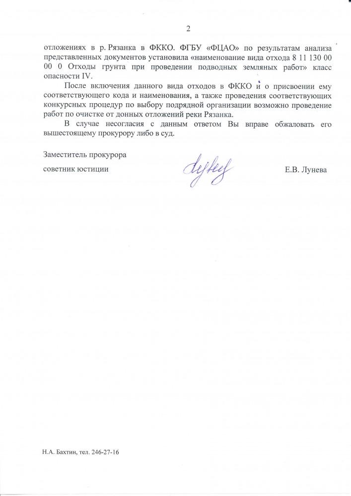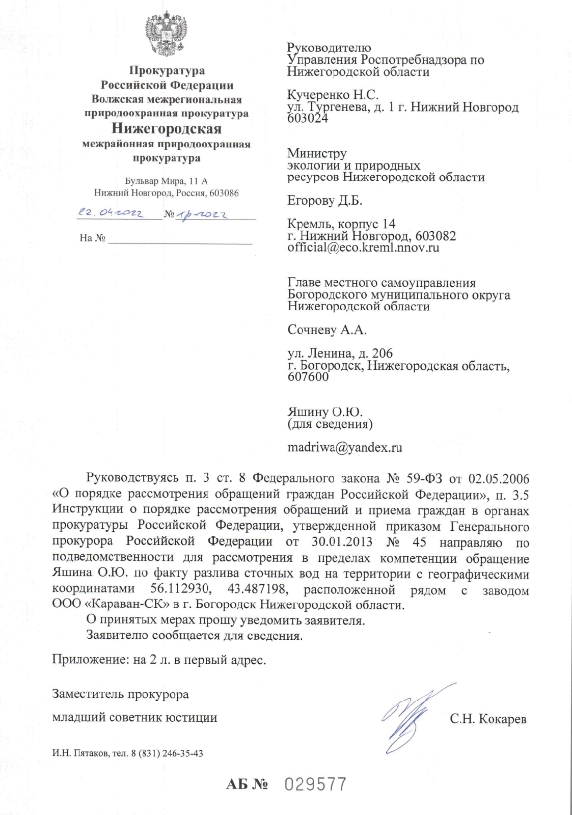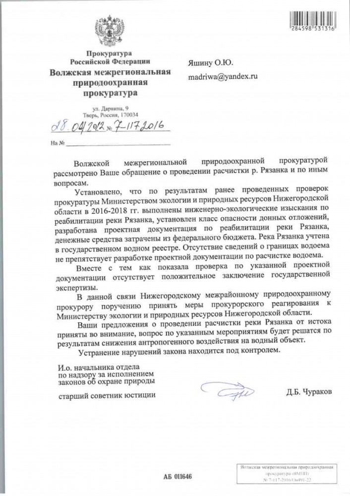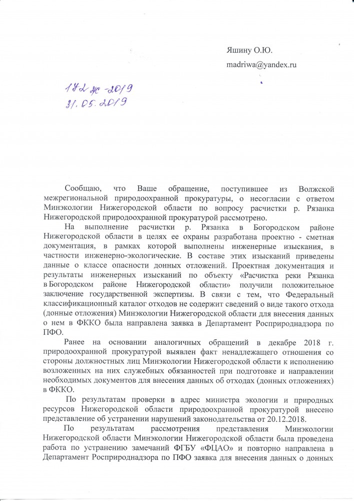 Добрый вечер всем. Как им после этого можно верить. Направил о несогласии: Я, Яшин Олег Юрьевич, город Богородск Нижегородская область. Не согласен с ответом И.о. начальника отдела по надзору за исполнением законов об охране природы (ответ в приложенном файле). Так как согласно ответа Нижегородской межрайонной природоохранной прокуратуры от 2019 года проектно-сметная документация по расчистке р. Рязанка получила положительное заключение государственной экспертизы. А сейчас мне отвечают обратное !!! Прошу пояснить это. Также вопрос остаётся открытым: Прошу Вас провести прокурорскую проверку и предоставить мне достверную информацию, как могли спроектировать и согласовать эту документацию если р. Рязанка не стояла на государственном кадастровом учёте ? Считаю это факт халатности. Ответ прошу Вас направить мне за подписью Волжского межрегионального природоохранного прокурора.