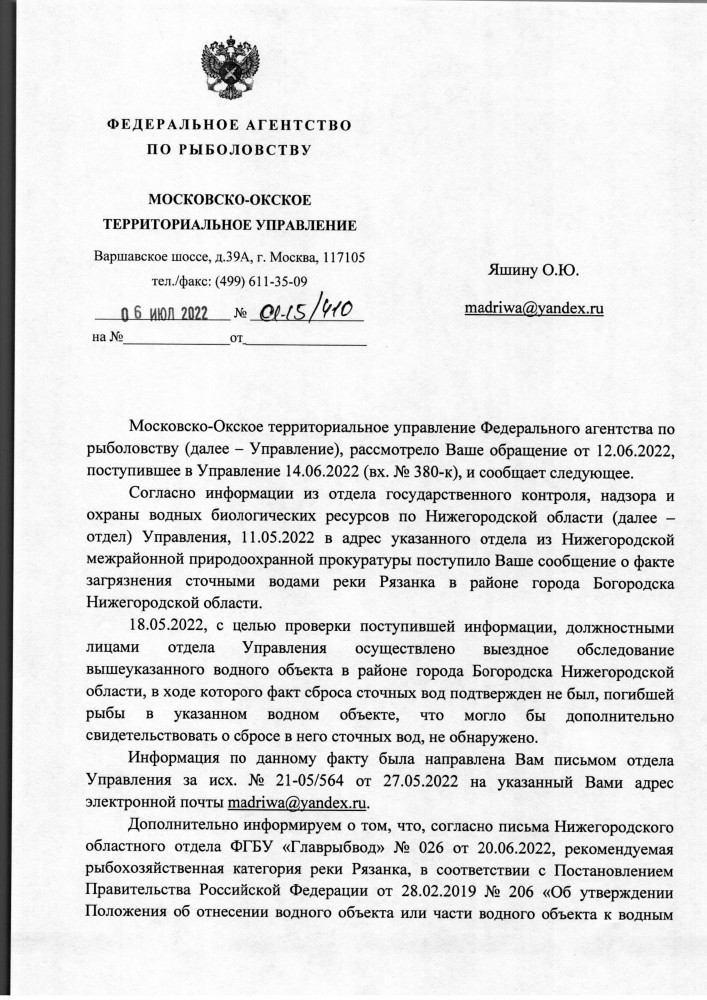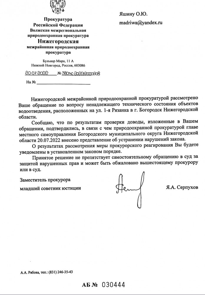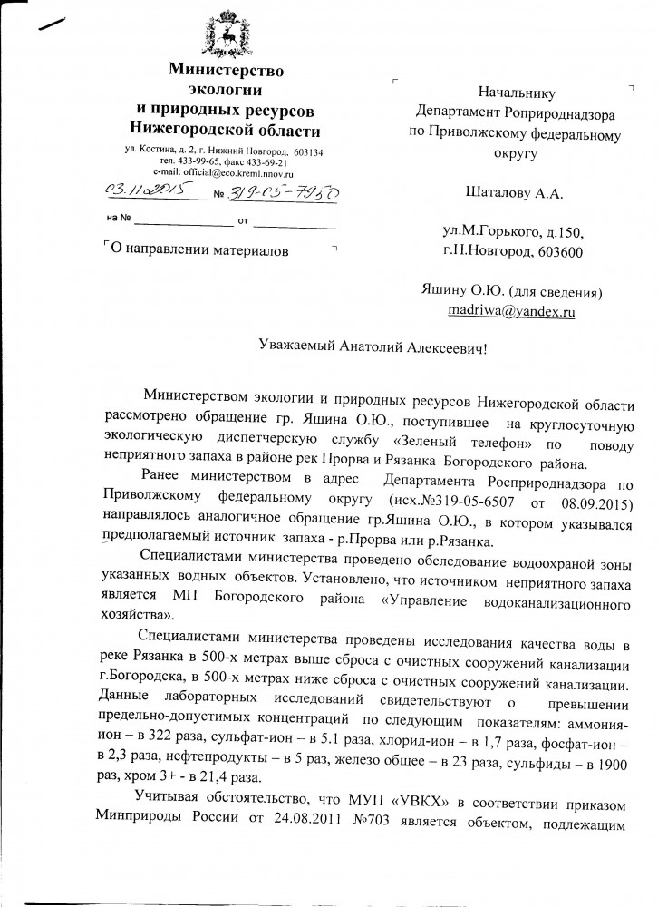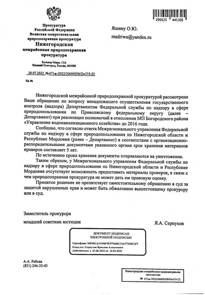 Я, Яшин Олег Юрьевич, город Богородск Нижегородская область. Не согласен с ответом заместителя Нижегородского межрайонного природоохранного прокурора. Так как документы подлежат уничтожению через 5 лет если была в данном случае прокурорская проверка. Данной проверке небыло, значит считаю это незаконно. Прошу Вас принять прокурорские меры и затребовать эти документы через суд. Ответы в приложенном файле. Ответ прошу Вас направить мне за подписью прокурора. Жители города Богородска поясняю, кто не в теме: до 2016 года Богородские городские очистные сооружения находились на федеральном государственном экологическом надзоре, как началась заварушка они решили уйти от ответственности и передали наши городские очистные сооружения Министерству экологии и природных ресурсов Нижегородской области. ----------