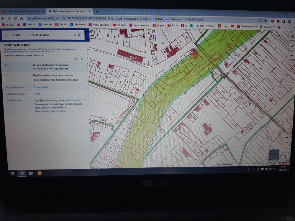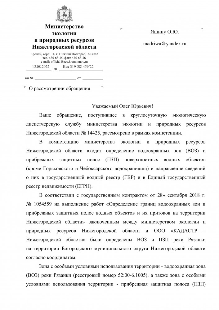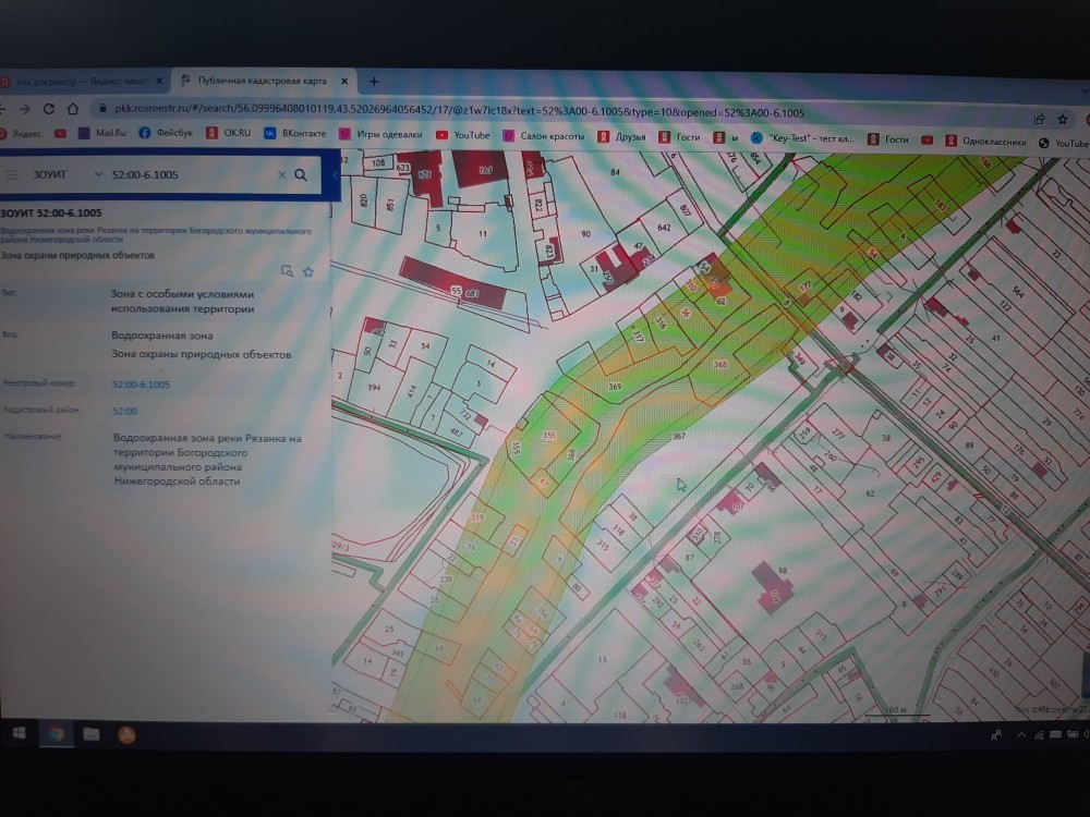 Я, Яшин Олег Юрьевич, город Богородск Нижегородская область. Сообщаю Вам, что водоохранная зона и прибрежная защитная полоса с кадастровыми номерами 52:00-6.1005 и 52:00-6.1004 отсутствуют на улице 1-я Рязанка от Богородской обувной фабрики до центра города. Исток речки Рязанки в районе Богородской обувной фабрики. Там два родника !!! Координаты: 56.101491, 43.509891 здесь большой родник, он даже зимой не замерзает. 56.101529, 43.511415 здесь маленький родник. Они соединяются и текут в центр города. Прошу Вас организовать работу, что бы обследовать эти места с прокурорской проверкой по данному факту. Скрины в приложенном файле. ----------