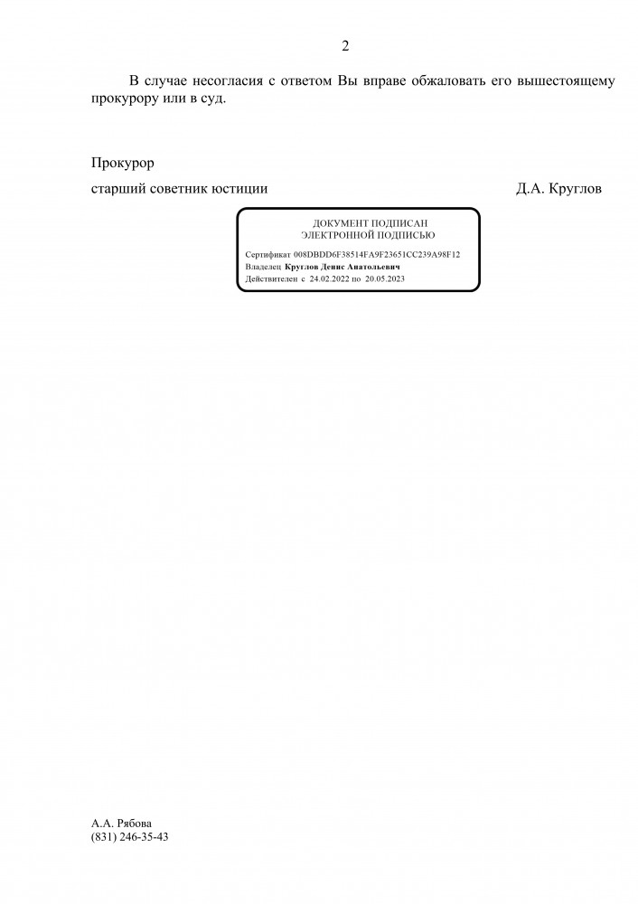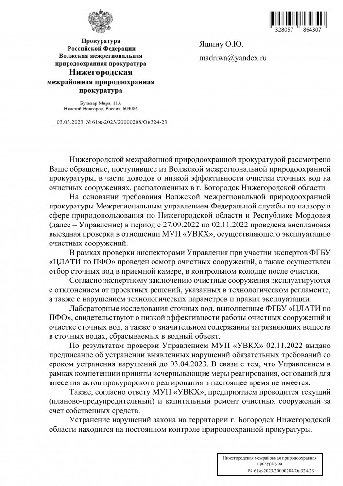 Дополнительно сообщаю, что по факту допущенных разливов сточных вод на почву и в р. Рязанка природоохранной прокуратурой в адрес главы местного самоуправления Богородского муниципального округа Нижегородской области и директора МУП «УВКХ» 13.04.2023 внесены представления. В целях организации отбора проб почвы после высыхания сточных вод для дальнейшего расчета ущерба природоохранной прокуратурой направлено письмо в Межрегиональное управление Росприроднадзора по Нижегородской области и Республике Мордовия, для установления факта причинения вреда р. Рязанка – в Министерство экологии и природных ресурсов Нижегородской области. ----------