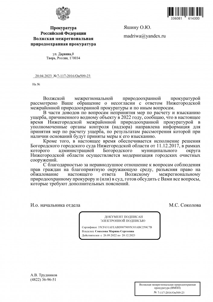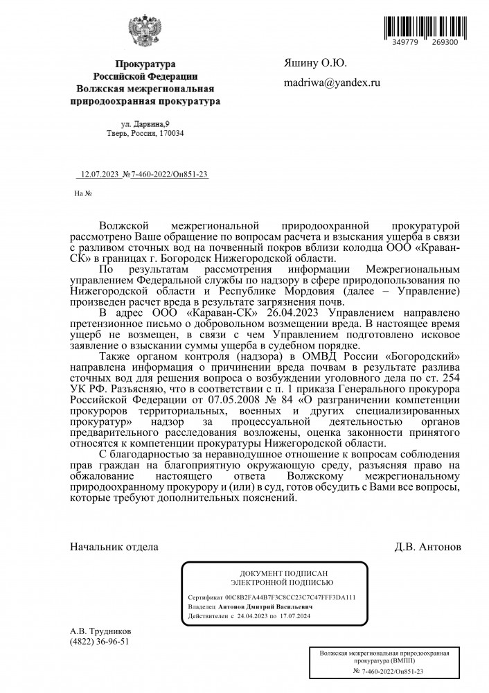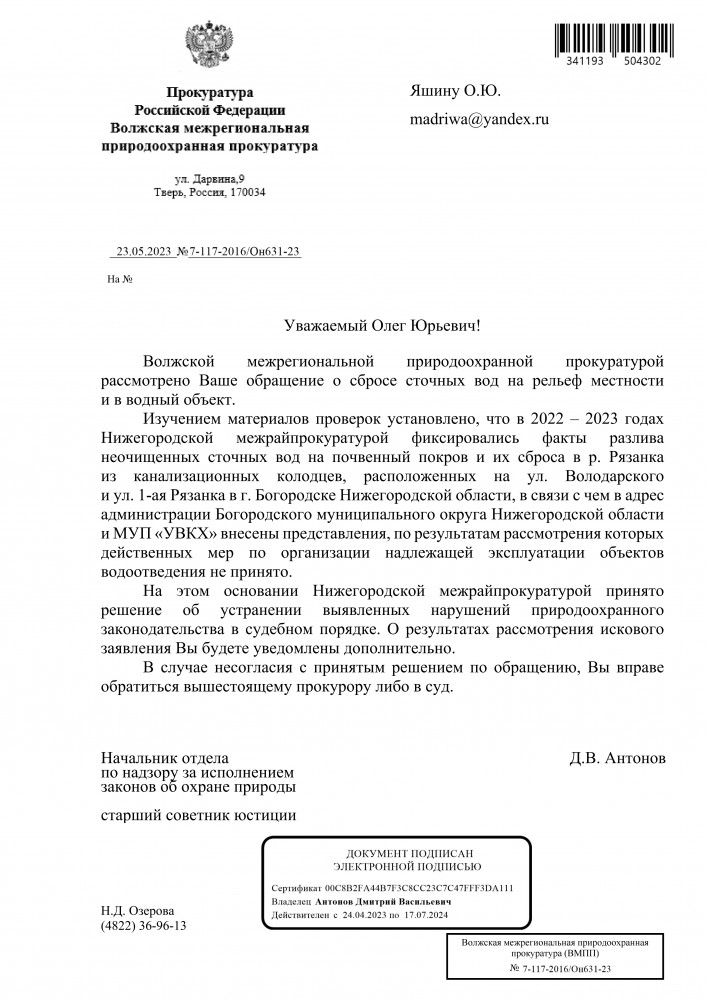 Добрый вечер всем. Ответ Волжской межрегиональной природоохранной прокуратуры на счёт разлива производственных сточных вод на почву.