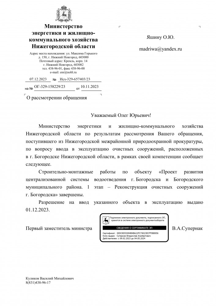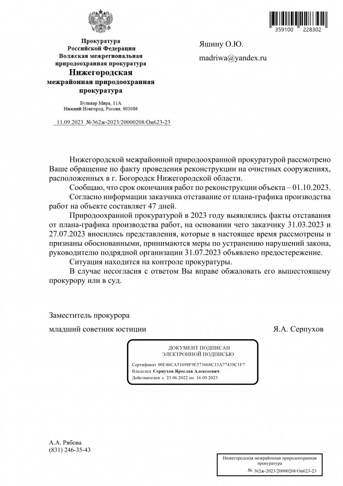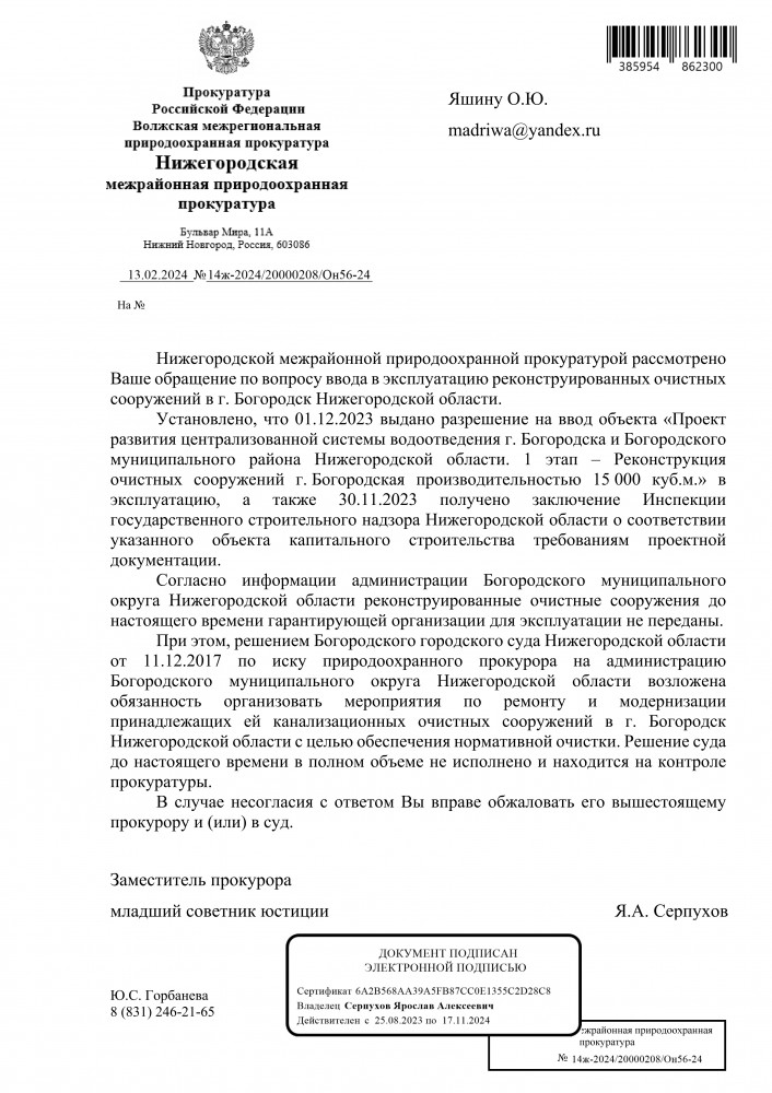 Добрый вечер всем. Спасибо, что успокоили нас жителей города Богородска, а именно что на контроле прокуратуры. Интересно ещё, что: Согласно информации администрации Богородского муниципального округа Нижегородской области реконструированные очистные сооружения до настоящего времени гарантирующей организации для эксплуатации не переданы.