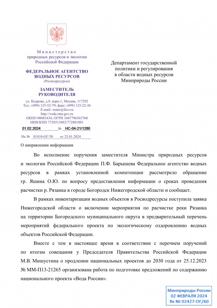 Добрый вечер всем. Жители города Богородска Нижегородской области согласно этого ответа Федерального агентства водных ресурсов я делаю вывод, что расчистка р. Рязанка опять откладывается на неопределенный срок. Печально всё, а сколько было ответов, что вот вот будет расчистка только после реконструкции очистных сооружений. Реконструкция городских очистных сооружений закончилась, новые очистные сооружения не понятно запущены или нет и расчистки речки нет. Хотя деньги выделялись на проектно сметную документацию и она даже получила в 2019 году положительное заключения государственной экспертизы, но заморозили видимо, ждали реконструкцию городских очистных сооружений, обновления проекта на расчистку и опять прохождения государственной экспертизы. Вроде реконструкция прошла, а расчистки опять не будет !!! Борьба продолжается жители города Богородска, не опускаем руки !!!