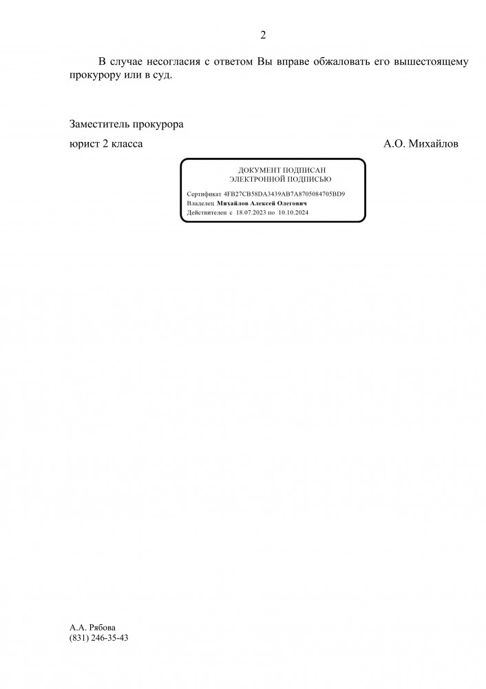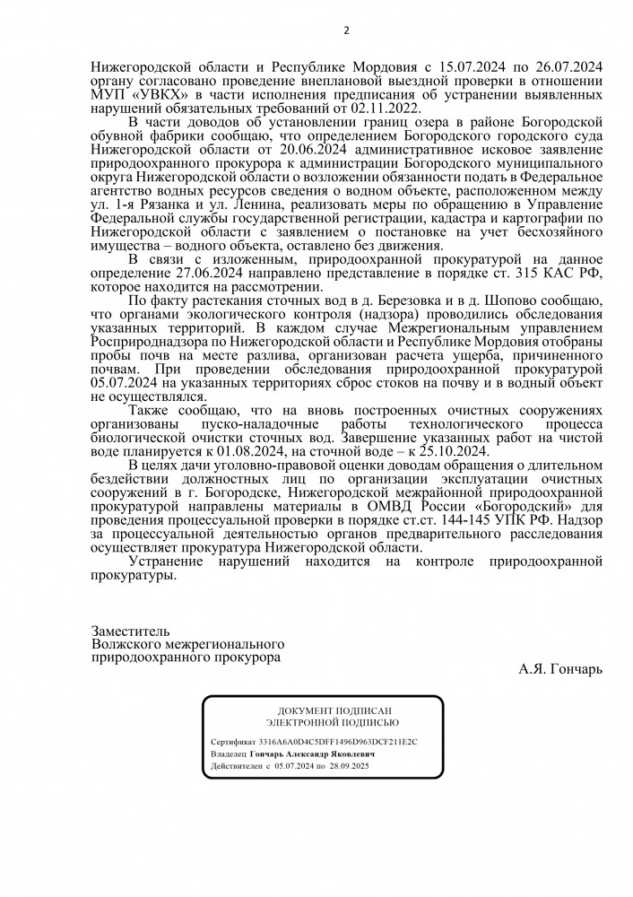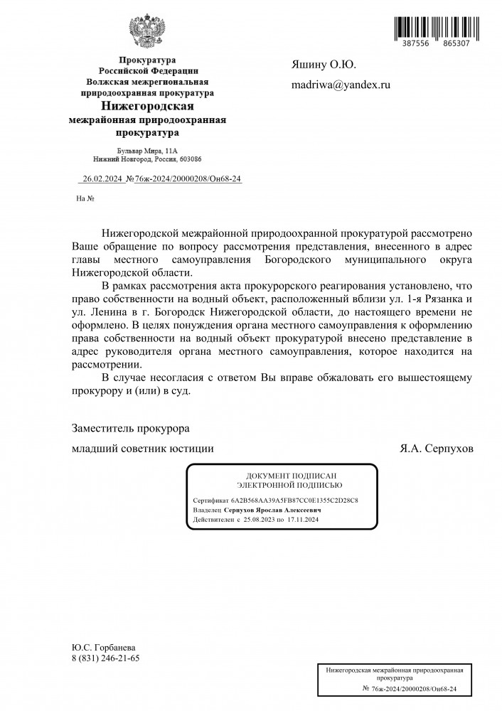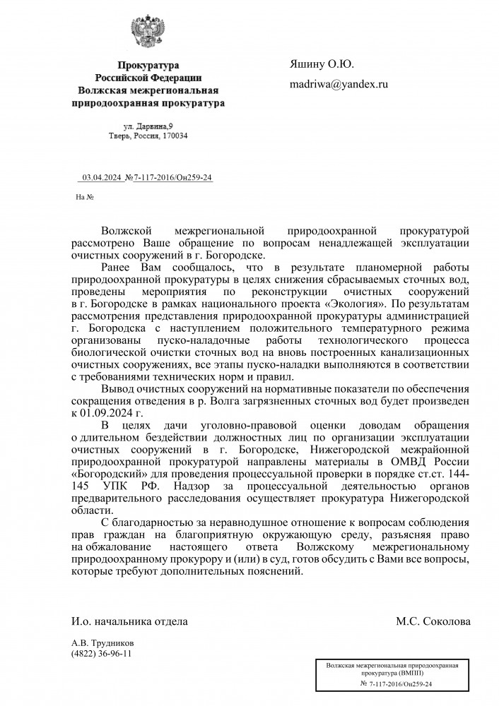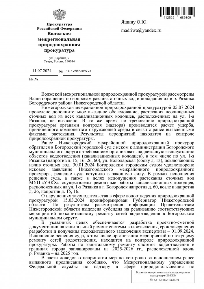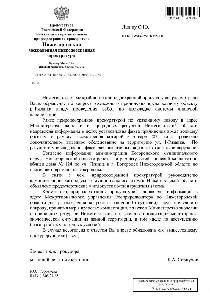 Я, Яшин Олег Юрьевич, житель города Богородск Нижегородской области. Согласно ответа межрайонного природоохранного прокурора в приложенном файле: На основании изложенного, в части доводов о возможном причинении вреда водному объекту р. Рязанка в результате проведения работ по прокладке системы ливневой канализации природоохранной прокуратурой 06.12.2023 направлялась информация в Министерство. Срок предоставления ответа на данную информацию в настоящее время не истек. Прошу Вас предоставить мне достоверную информацию, а именно было ли у них разрешение направлять трубы к истоку р. Рязанка. Это может вызвать дополнительное загрязнение водного объекта. Ответ прошу направить на мою электронную почту. А вот интересный ответ, это что значит нарушение есть или нет ?! В связи с чем, природоохранной прокуратурой руководителю администрации Богородского муниципального округа Нижегородской области объявлено предостережение о недопустимости нарушения закона. ----------