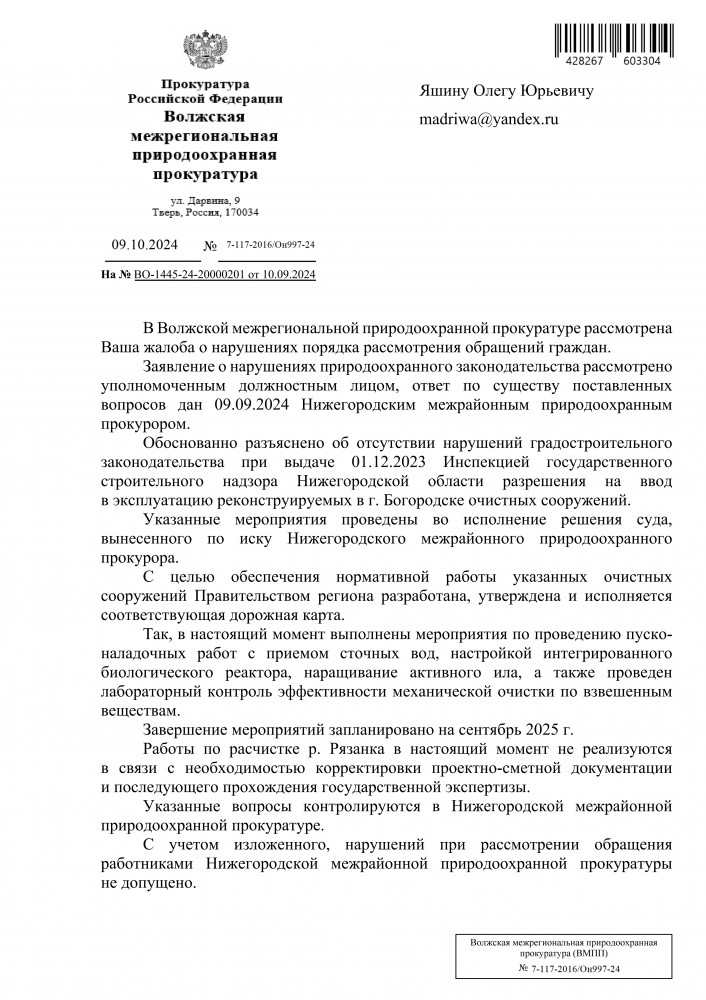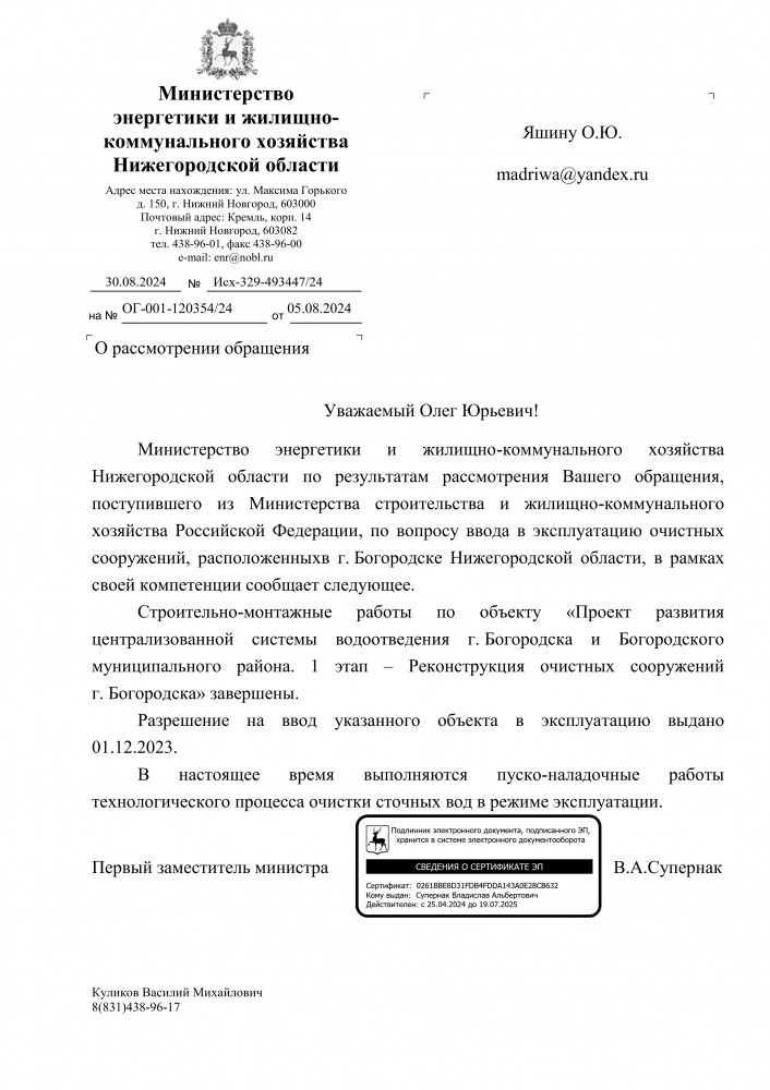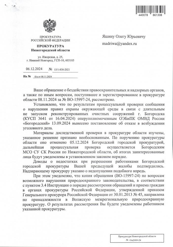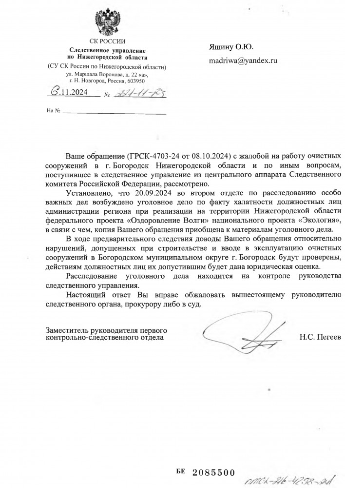 Направил о несогласии с ответом: Я, Яшин Олег Юрьевич, житель города Богородска. Не согласен с ответом И.о. начальника управления по надзору за следствием, дознанием и оперативно разыскной деятельностью Морозов Е.И., в приложенном файле. Сообщаю, что 01.12.2023 выдано разрешение на ввод очистных сооружений производительностью 15 000 м³ в эксплуатацию и расположенных на территории г. Богородск Нижегородской области, в ноябре 2023 года получено заключение от Инспекции государственного строительного надзора Нижегородской области о соответствии вышеуказанного объекта капитального строительства требованиям проектной документации. Следовательно после ввода очистных сооружений в эксплуатацию они должны были очищать сточные воды согласно установленным нормативам Федерального агентства водных ресурсов, что не происходит по настоящее время. Решения на сброс сточных вод в водный объект р. Рязанка у МУП "УВКХ" нет по настоящее время, значит очистные сооружения после реконструкции по факту не запущены. Пусконаладочные работы должны были ещё проведены до 01.12.2023 года, а не после ввода очистных в эксплуатацию. Это факт нарушения законодательства Российской Федерации, который умалчивается прокуратурой, считаю это факт бездействия. Прошу прокурора Нижегородской области принять срочно эффективные прокурорские меры по возбуждению уголовного дела, по факту незапуска Богородских городских очистных сооружений после реконструкции. Ответ прошу направить за подписью прокурора Нижегородской области на мою электронную почту. ----------