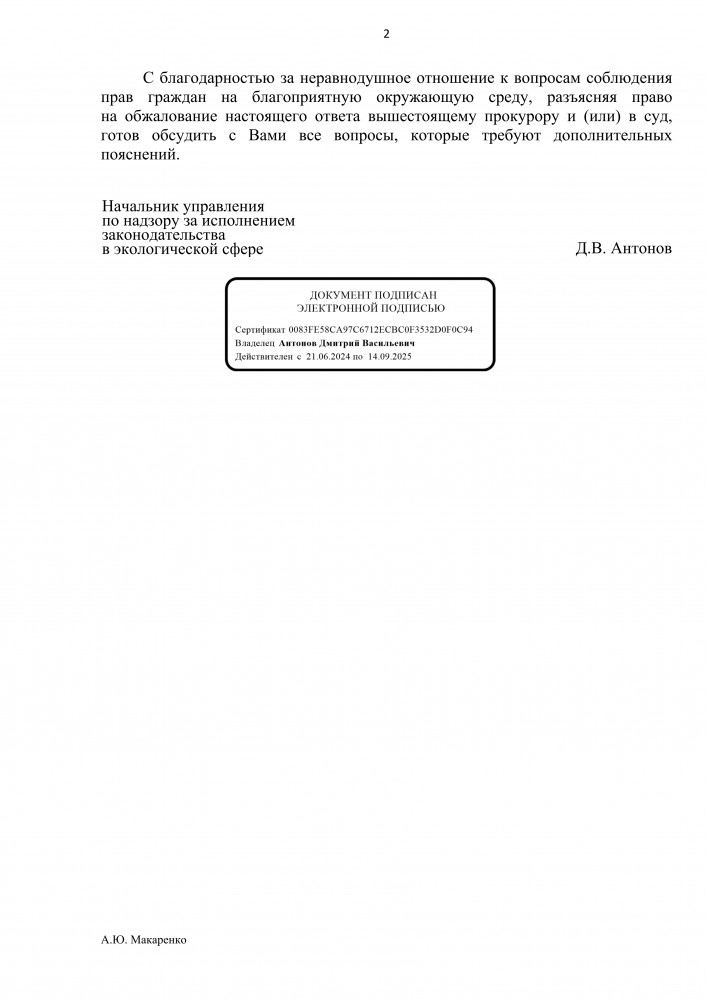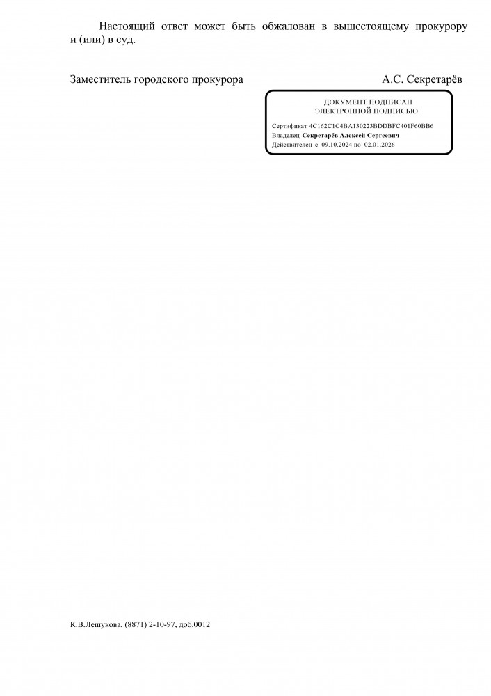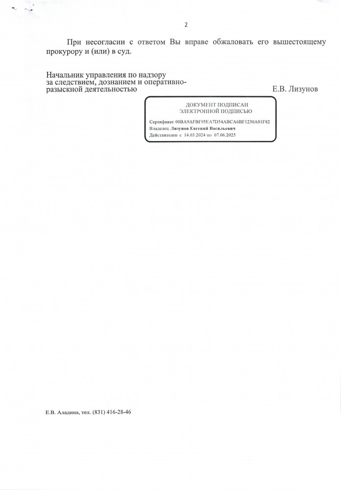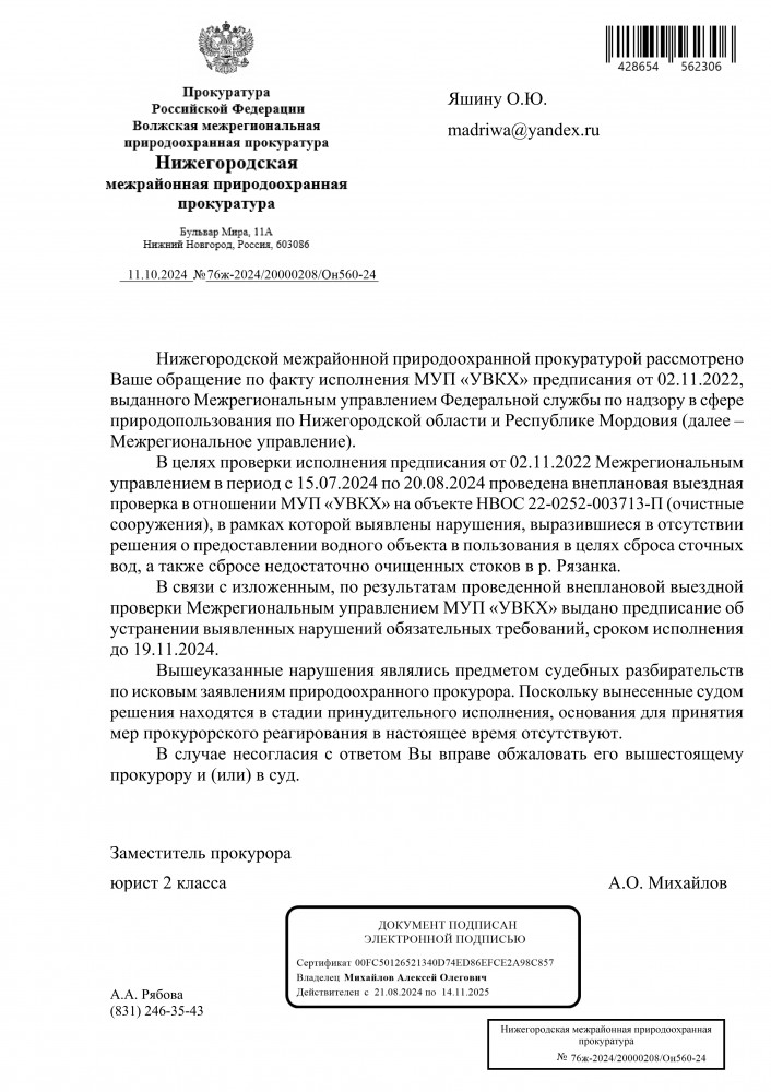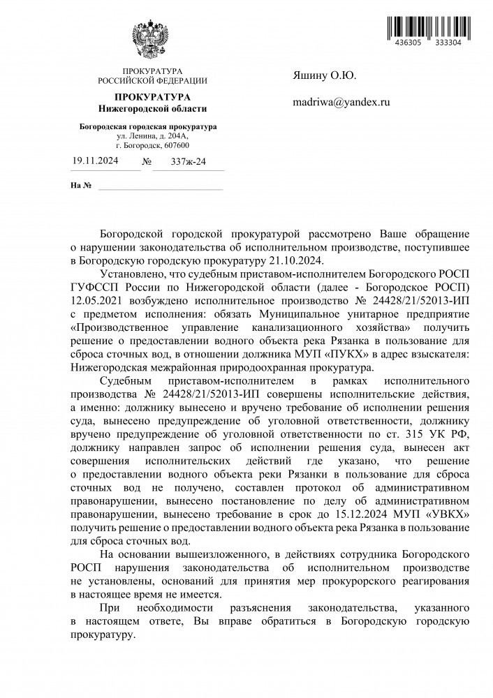 Направил о несогласии с ответом: Я, Яшин Олег Юрьевич, житель города Богородска. Не согласен с ответом И.о. начальника управления по надзору за следствием, дознанием и оперативно разыскной деятельностью Морозов Е.И., в приложенном файле. Сообщаю, что 01.12.2023 выдано разрешение на ввод очистных сооружений производительностью 15 000 м³ в эксплуатацию и расположенных на территории г. Богородск Нижегородской области, в ноябре 2023 года получено заключение от Инспекции государственного строительного надзора Нижегородской области о соответствии вышеуказанного объекта капитального строительства требованиям проектной документации. Следовательно после ввода очистных сооружений в эксплуатацию они должны были очищать сточные воды согласно установленным нормативам Федерального агентства водных ресурсов, что не происходит по настоящее время. Решения на сброс сточных вод в водный объект р. Рязанка у МУП "УВКХ" нет по настоящее время, значит очистные сооружения после реконструкции по факту не запущены. Пусконаладочные работы должны были ещё проведены до 01.12.2023 года, а не после ввода очистных в эксплуатацию. Это факт нарушения законодательства Российской Федерации, который умалчивается прокуратурой, считаю это факт бездействия. Прошу прокурора Нижегородской области принять срочно эффективные прокурорские меры по возбуждению уголовного дела, по факту незапуска Богородских городских очистных сооружений после реконструкции. Ответ прошу направить за подписью прокурора Нижегородской области на мою электронную почту. ----------