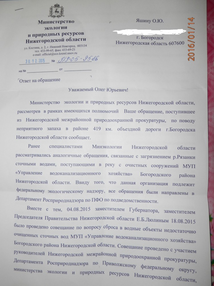 Добрый вечер всем! Я ожидал от Департамента другой ответ, а так вроде отписки! Мною было написано обращение в Прокуратуру Нижегородской области и приложен этот ответ, о нарушение наших прав на благоприятную окружающею среду согласно Конституции РФ статья 42.