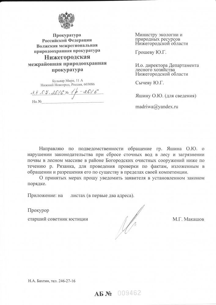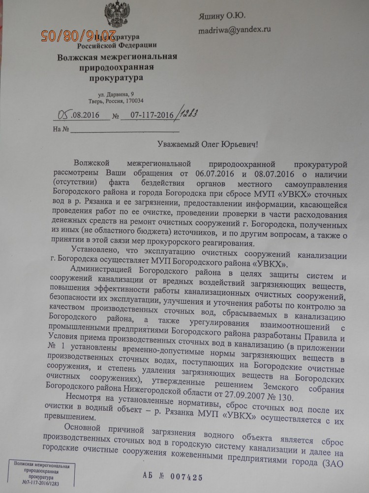 Я НЕ ОТСЮДА Мною было направлено туда обращение вот с такой формулировкой: Я, Яшин Олег Юрьевич, согласно Вашего ответа мне от 30.06.2016 № 7-117-2016, прошу Вас пояснить мне имеется ли факт бездействия местного самоуправления Богородского района и администрации города Богородска в отношение загрязнение р. Рязанка. Так как МП Богородского района «Управление водоканализационного хозяйства» относится к администрации города Богородска. Какие прокурорские меры будут приняты к руководителям местного самоуправления Богородского района и администрации города Богородска по факту загрязнения р. Рязанка, а именно в бездействие на протяжение многих лет, согласно законодательства РФ. Также прошу Вас предоставить мне достоверную информацию, а именно будут ли проведены работы по очистке р. Рязанка в городе Богородске и когда. Жду ответ, в начале августа. ----------