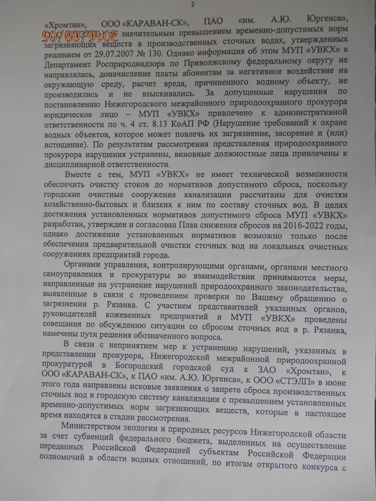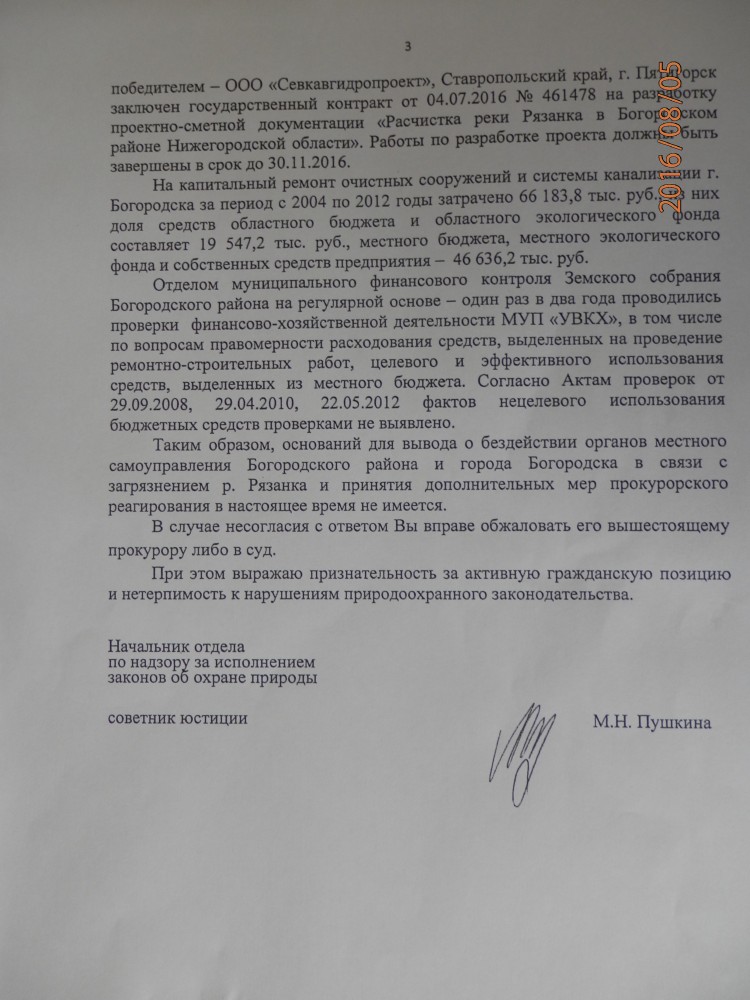 Я, Яшин Олег Юрьевич, не согласен с Вашим ответом от 05.08.2016 года № 07-117-2016/1283. Считаю, что Департамент Росприроднадзора по Приволжскому федеральному округу проявил бездействия, а именно данный департамент занимался только отписками и перенаправлял мои обращения в Министерство экологии по Нижегородской области. Прошу Вас сделать запрос по Всем моим обращениям зарегистрированные в данном департаменте по реке Рязанка, изучить их и дать мне ответ для чего нужен данный департамент если он пишет только отписки и перенаправляет наши обращения. Также я не согласен, что наше местное самоуправление и администрация города Богородска Нижегородской области сделало всё чтобы не допустить экологическую катастрофу в нашем Богородском районе, т.е. отсутствие бездействия. Вами выявлен факт бездействия МУП "УВКХ", данная организация относится к местному самоуправлению и администрации города Богородска, значит они должны в первую очередь нести ответственность. Деньги на ремонт очистных были выделены, а сбросы продолжаются с нарушением. Предлагаю Вам лично приехать к нам в Богородск, Нижегородская область, а именно на 419-420 км дорога Павлово - Н. Новгород. Спуститься вниз к р. Рязанка и Вы ощутите этот "приятный запах", пройдите вниз против течения к очистным и Вы увидите все нарушения. Фото и видео я Вам уже направлял от 10.07.2016 года на данную электронную почту. Наведите порядок в нашем Богородском районе. ----------